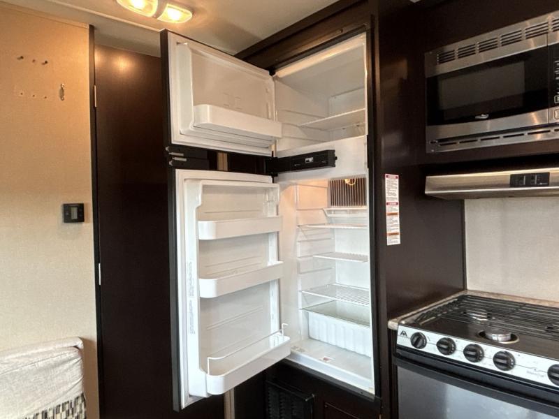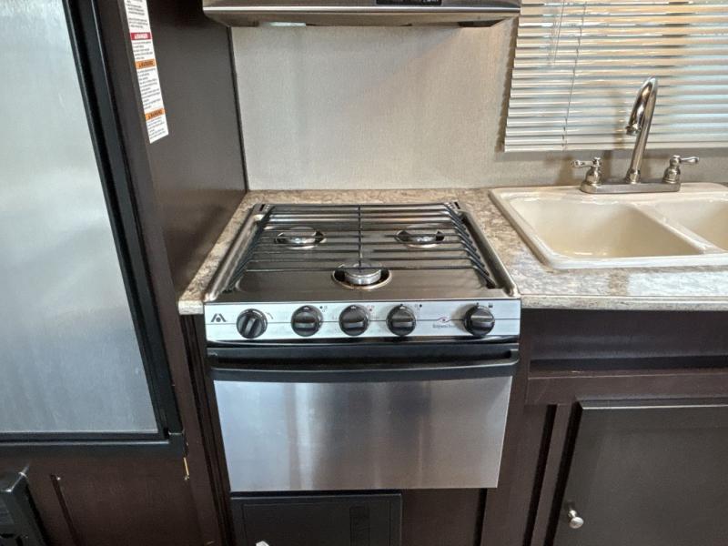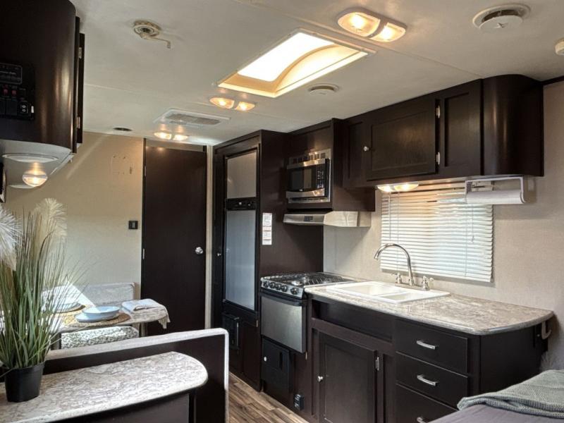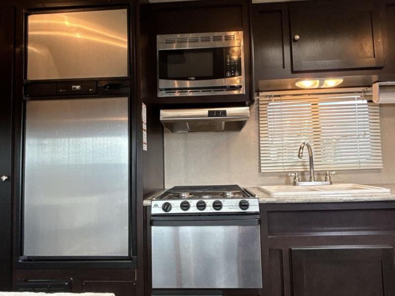 You can easily cook up and enjoy light meals and snacks with the appliances and dining space inside. There is a pantry for dry and canned foods, a refrigerator, a three burner range with overhead microwave oven, and a double kitchen sink which is perfect for a making cleanup quick and easy. You will also find overhead cabinets for your dishes.