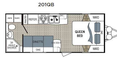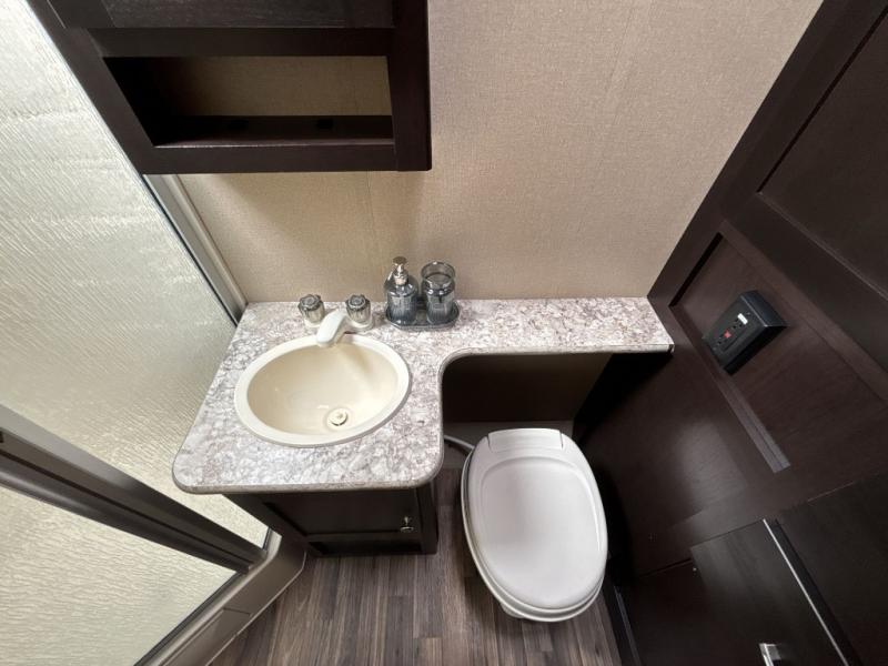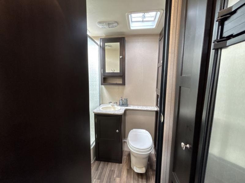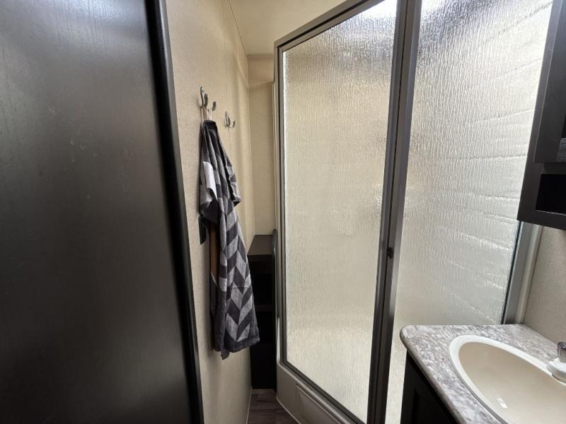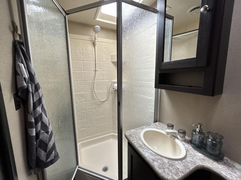 In the very rear of this Kodiak Express 201QB is a complete bath featuring a 34" angled shower, a vanity with sink, toilet, linen cabinet, and wardrobe.