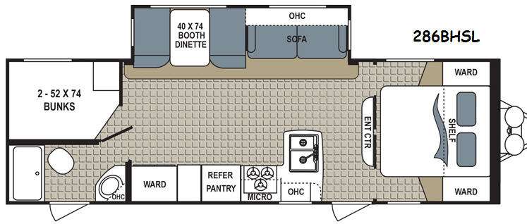 Adjacent to the bunks is a large slide out 40" x 74" booth dinette and sofa with overhead cabinets. These provides ample seating during the daytime hours and can easily be converted to sleeping space at night if needed.