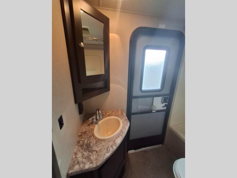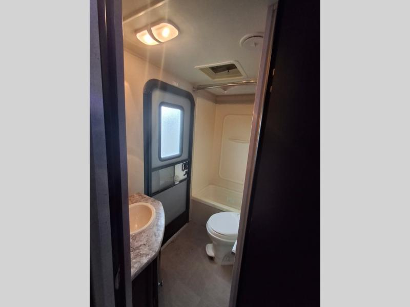 Step inside the rear most door and enjoy a bathroom featuring a tub/shower, toilet and sink. The outside entry door makes it much easier to access when spending time outdoors so you don't have to run all through the unit when you need to go.