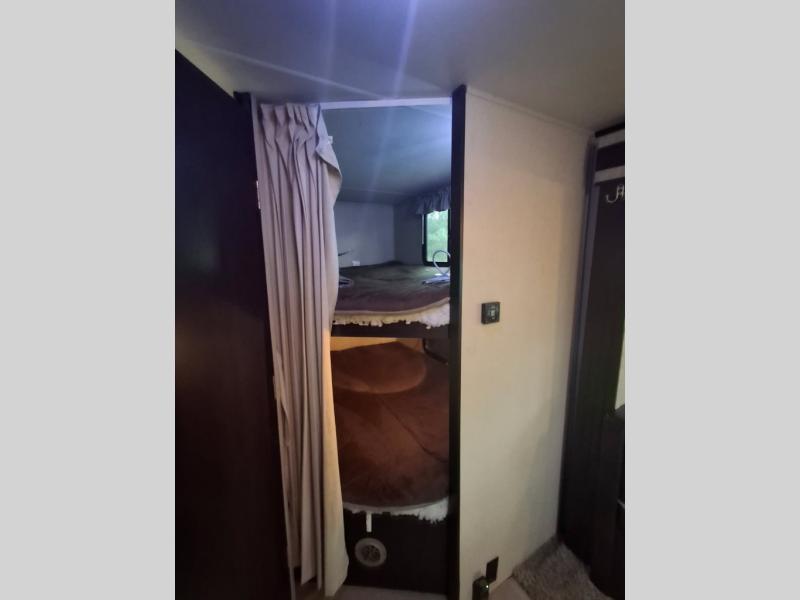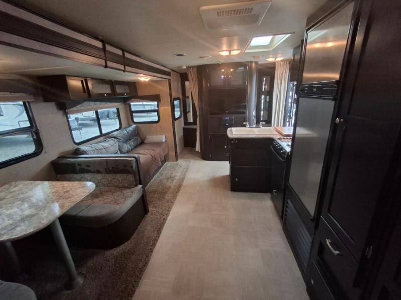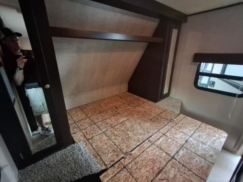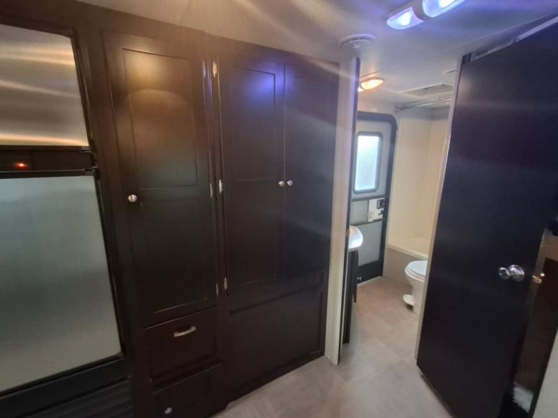The front side entry leads you into the living space with a bedroom up front on your right. There is an entertainment center just off the foot of the bed that features sliding doors on either side that allow you to close off the space for more privacy at night. Inside the bedroom enjoy a queen size bed, dual bedside wardrobes, an overhead shelf, and more!