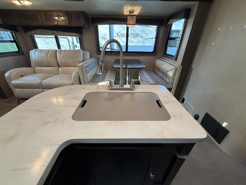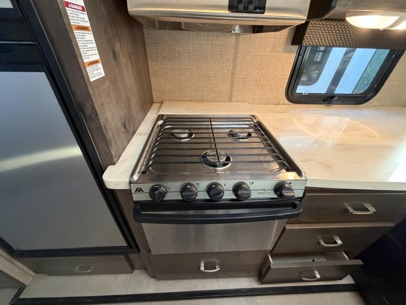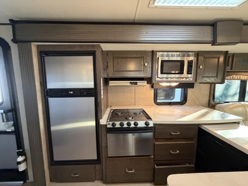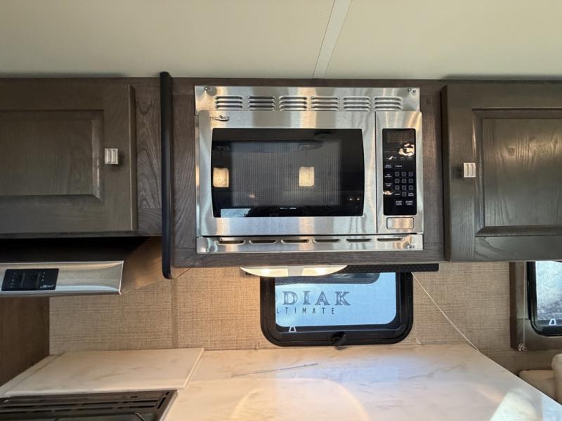 Enjoy cooking meals and preparing snacks in this Kodiak kitchen which provides ample counter space with an L-shaped counter including double sink, microwave, three burner range, and a refrigerator that slide out with a standard sofa toward the rear. There are plenty of overhead storage cabinets for dishes and things also.