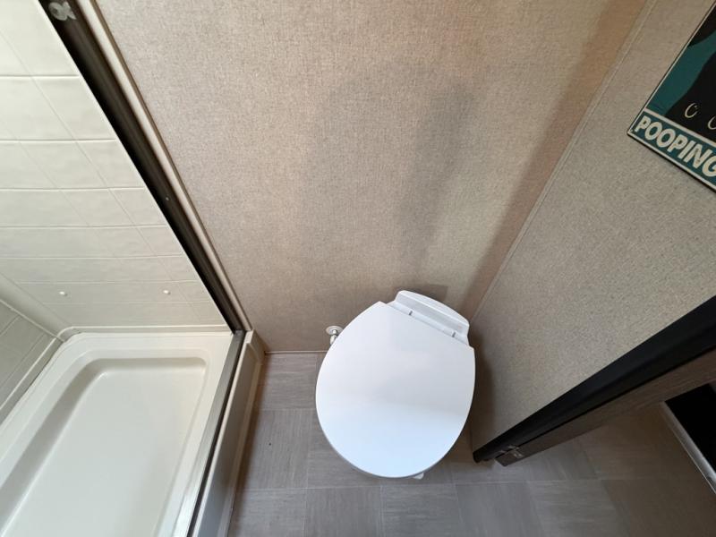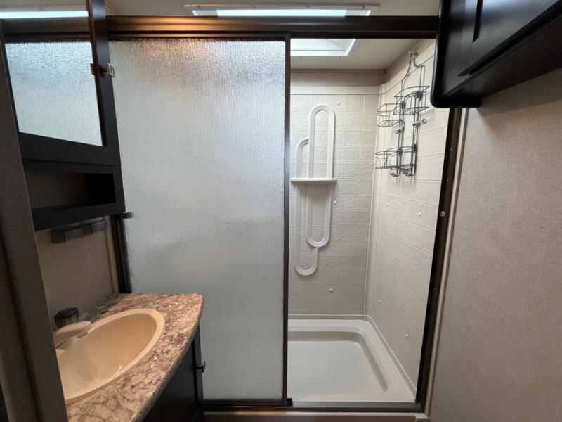 As you enter you will see a convenient bath straight ahead. The bath includes a shower with skylight, sink and toilet with overhead storage. To the right of the entry door there is a private bedroom with queen bed, two wardrobes, and an overhead storage cabinet.