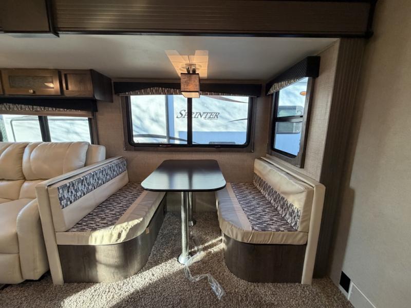 On the opposite side of the unit there is a 40" x 74" booth dinette and two lounge chairs with overhead storage.