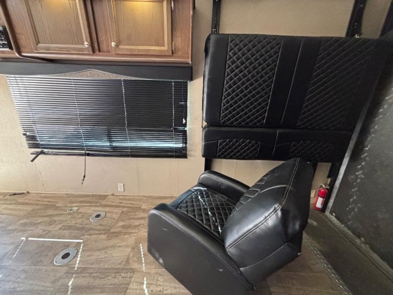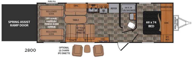 The rear spring assist ramp door makes your loading and unloading easy. There are two rollover sofas and the optional HappiJac power bunk above to provide ample seating and sleeping space for a few added friends. When not in use you can flip them up against the wall, and place the HappiJac bunk up to the ceiling, fold away the 72" dinette, and have plenty of space to load up the toys!