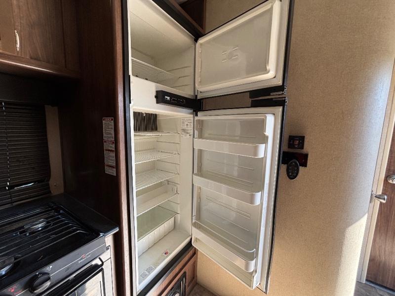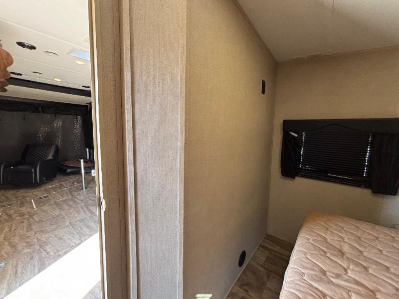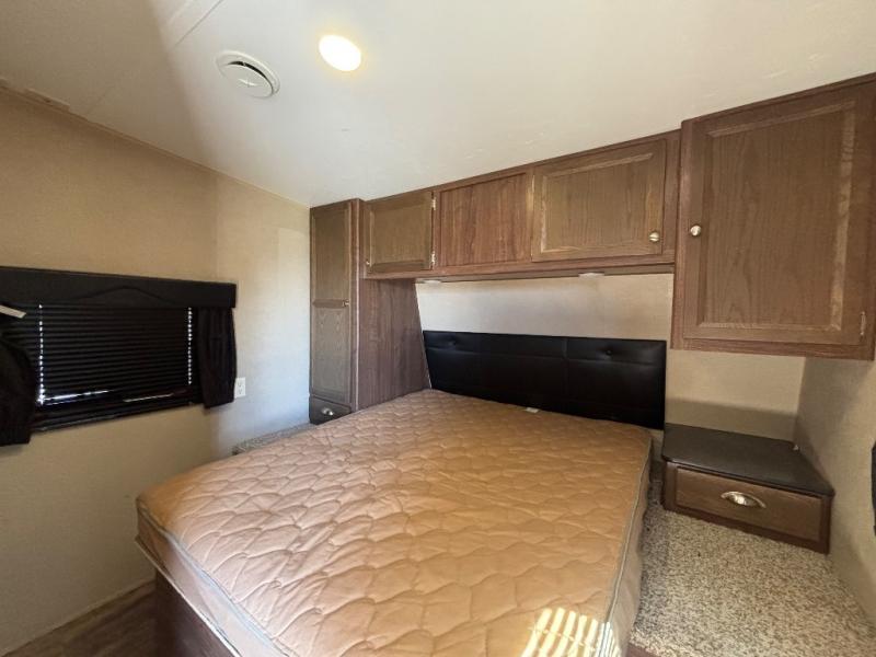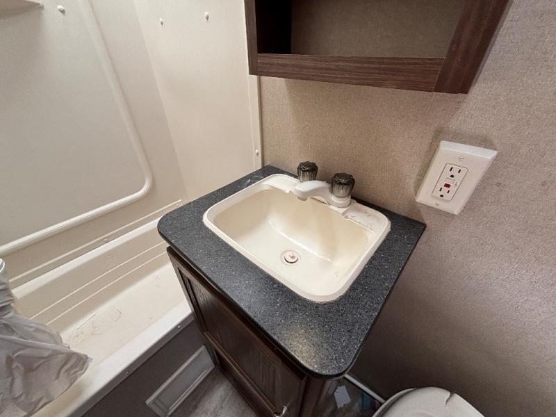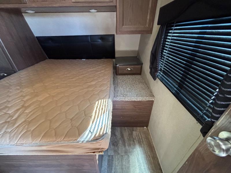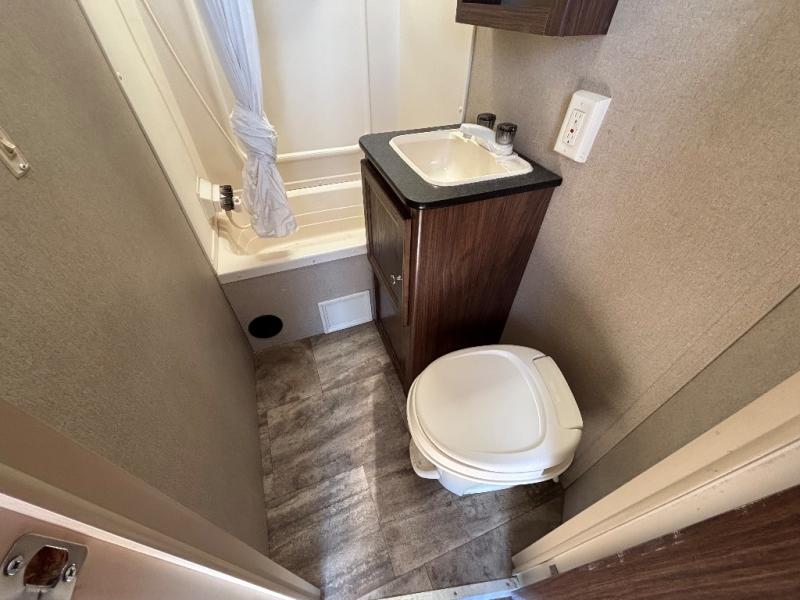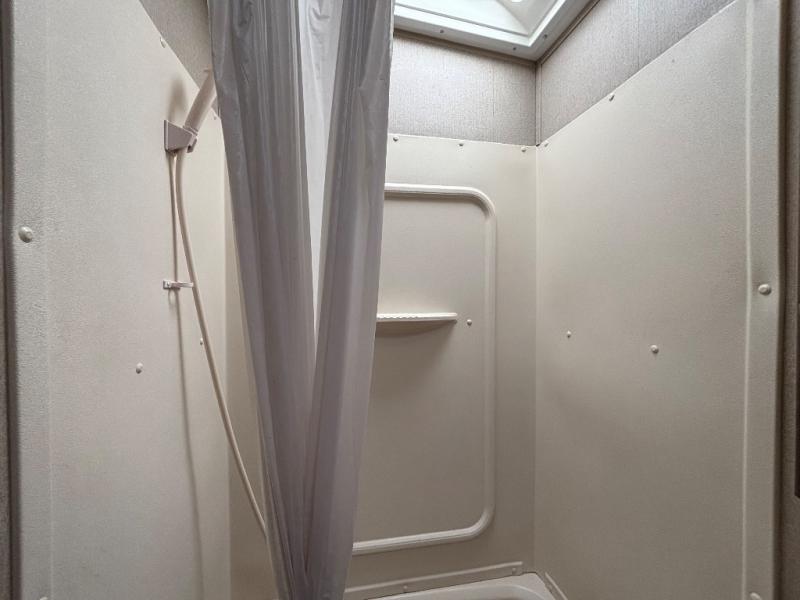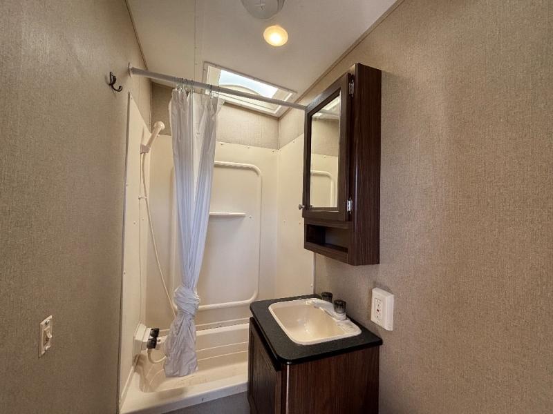 In StockEnter the side door and notice how conveniently the bathroom is located. Here you will find a toilet, sink with overhead cabinet, and a 38" x 24" shower almost directly across from the door. Just around the corner from the bathroom up front is a private master bedroom with plenty of space for a queen size bed and a bedside wardrobe, plus shirt closet and nightstand. You will easily be able to rest up for a new day of fun!