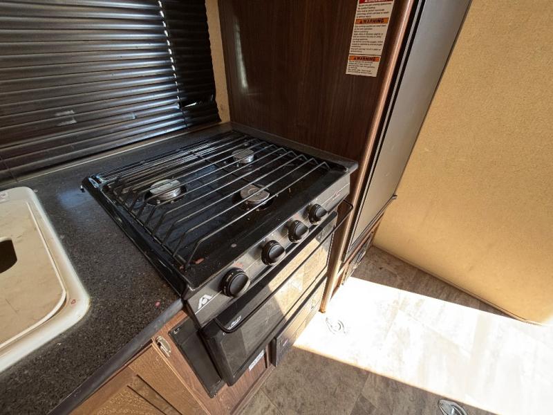 Along the opposite side find a kitchen including a refrigerator, a three burner range, and a double sink making cleaning up a cinch. Plus, there is also overhead cabinets to stow away your dishes and things.