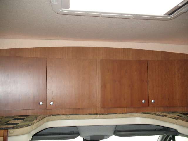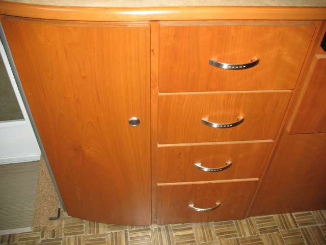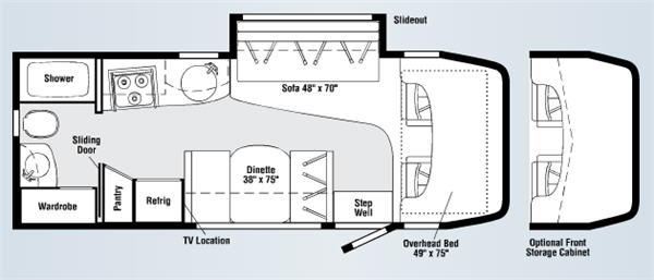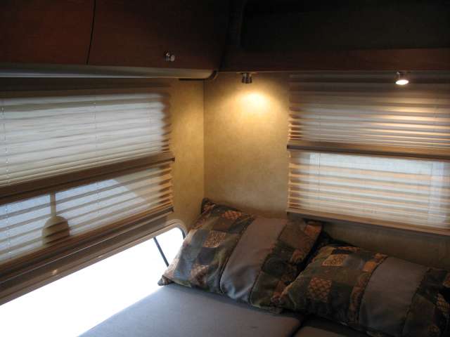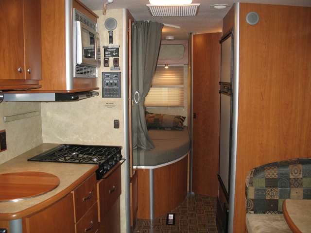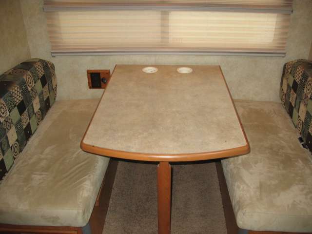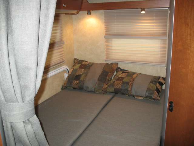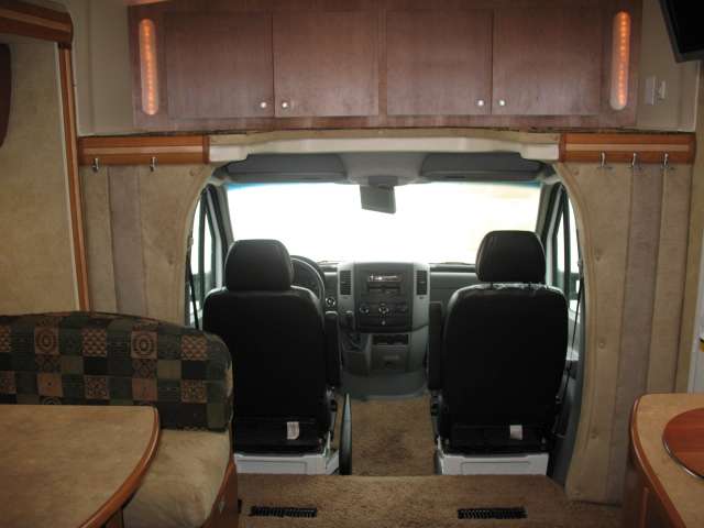 Once inside notice the large slide out reclining sofa seating lounge with stowable table. There is a corner storage cabinet just before the steps that lead up to the front master bedroom and bath.
