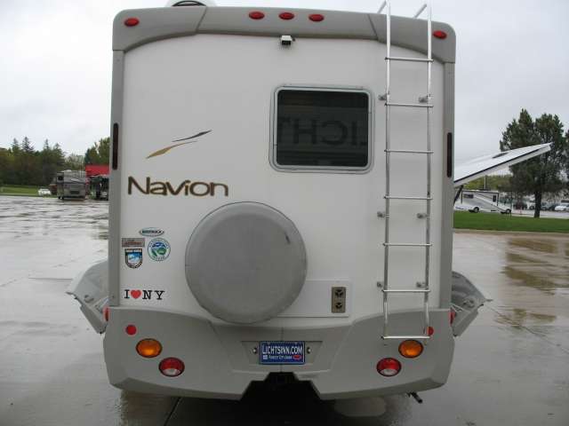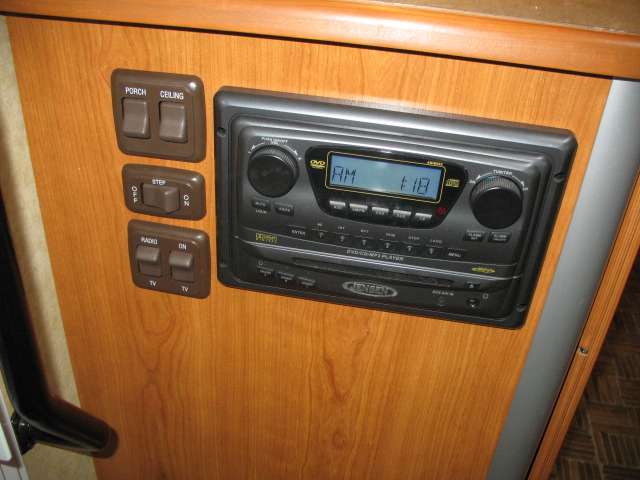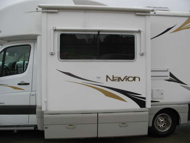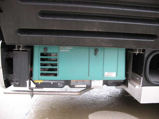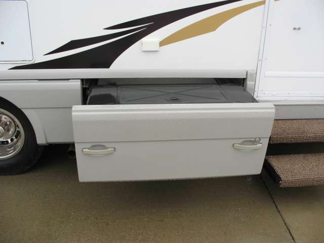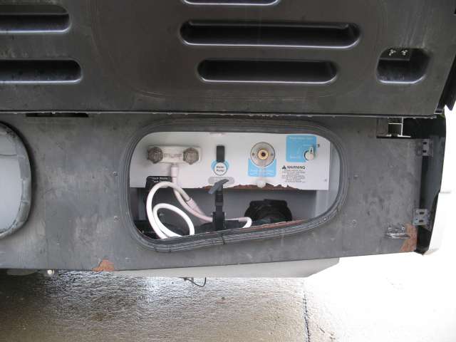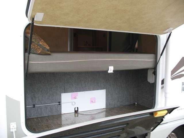 On the exterior there is a gasoline pump station, a pass-through storage compartment in the center, and an optional outside entertainment center also.