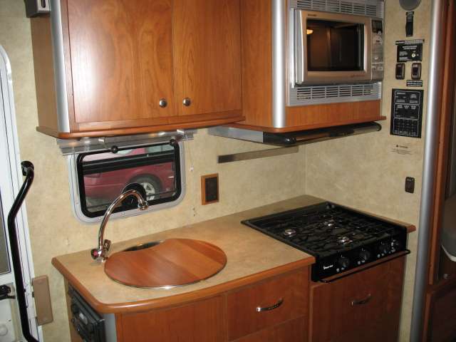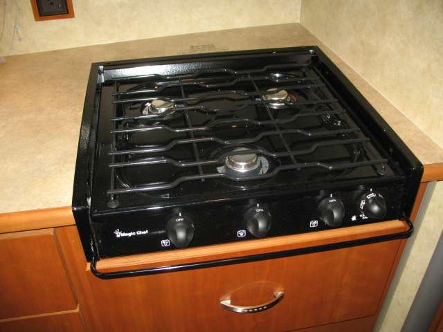 The kitchen offers a spacious area to prepare and cook food for your hungry crew. There is a pantry for dry good storage, a refrigerator, three burner range with 21" oven, and counter area with double kitchen sink. Plus, there is plenty of overhead storage for all of your dishes and things.