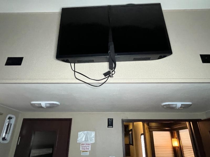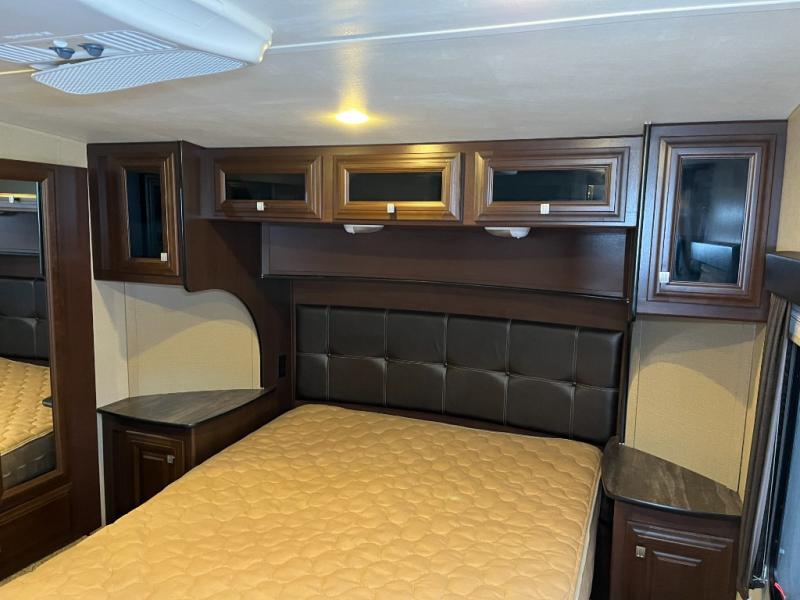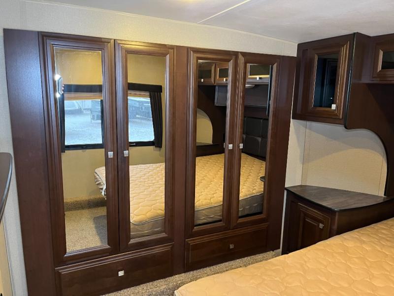 Continue down the hall to the front private bedroom with sliding pocket door. There is a queen bed with storage including nightstands on both sides of the bed. You will also find a slide out wardrobe and a 32" TV, plus overhead cabinets.