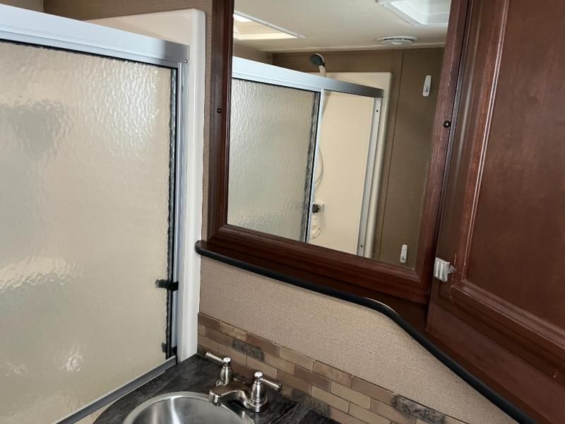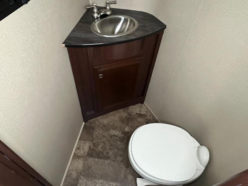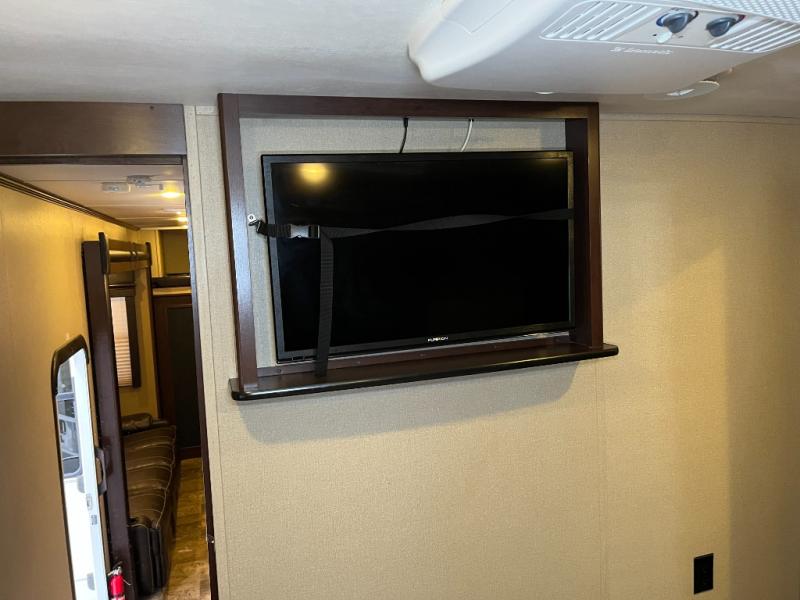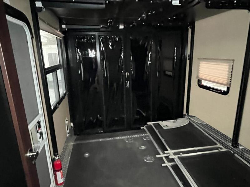 The 8' spring assist rear ramp door will make loading and unloading a breeze into the 11' cargo space provided. There is a 40" x 88" twin loft bed, and a 32" TV overhead cabinet in the cargo, plus a convenient half bath as well.
