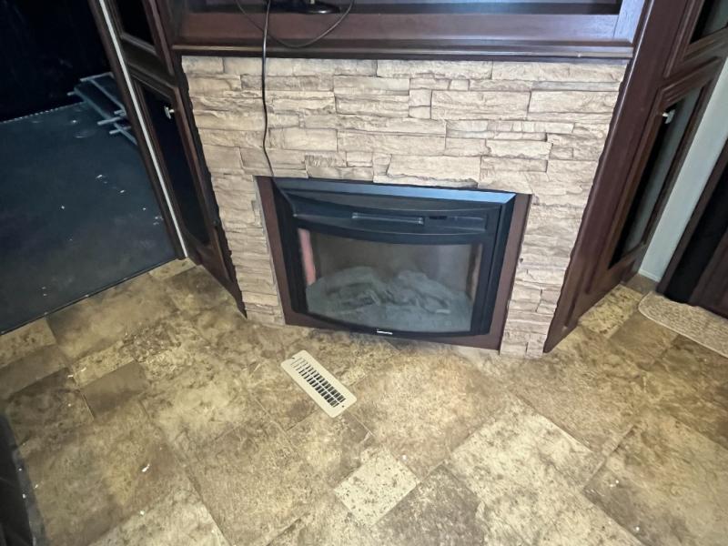 As you make your way into the main living area you will see a large sofa lounge slide out with a stowable table for dining. There is TV with fireplace below on the interior angled wall for easy viewing.