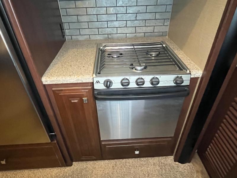 The kitchen features a slide out refrigerator, pantry, and a three burner range with microwave above. The counter peninsula features a double sink and overhead storage area. There is also a storage closet near the counter straight in from the main entry door.