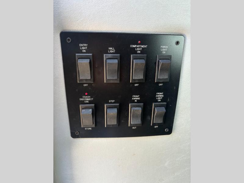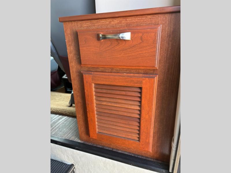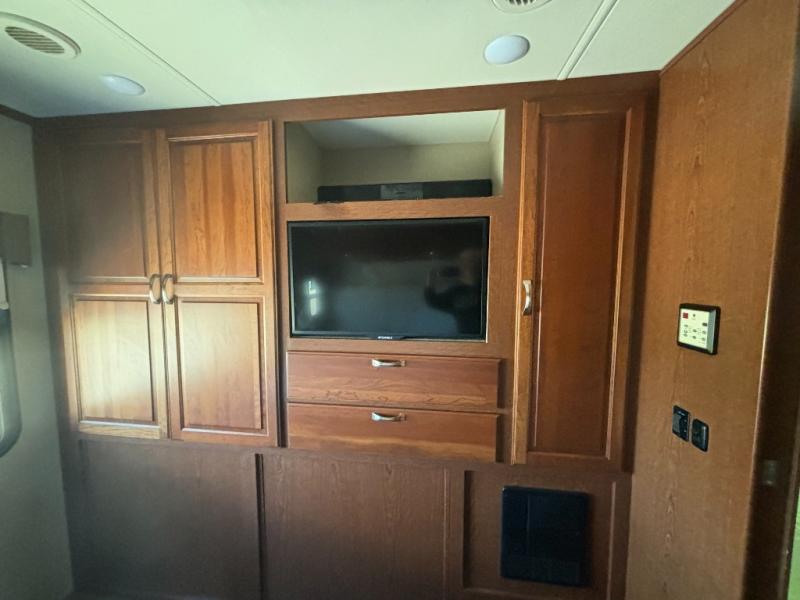In the rear bedroom the king bed is on a slide. The overhead cabinet helps to keep your things neat and organized. Across from the bed find more storage with a wardrobe, drawers, and a closet. Above the drawers there is a 32" TV, and more!