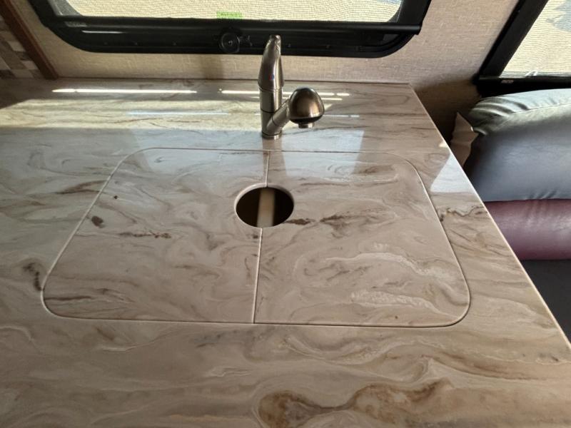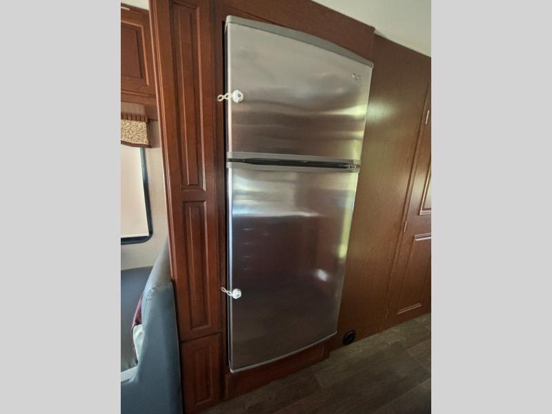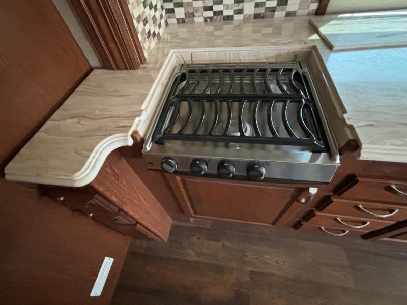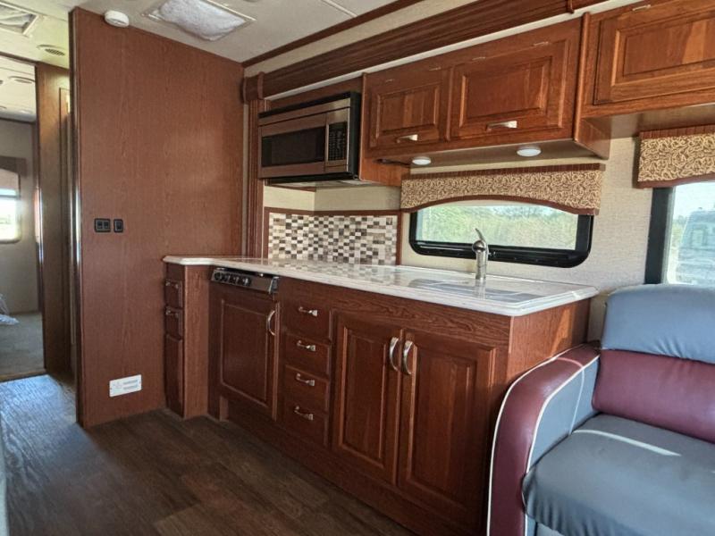 To the left of the entrance there is a dream dinette with an overhead cabinet above. Just past the dinette there is a pantry and refrigerator. On the opposite side of the motor home you will find a slide with a sofa, double kitchen sink, three burner range, microwave, and overhead cabinet.