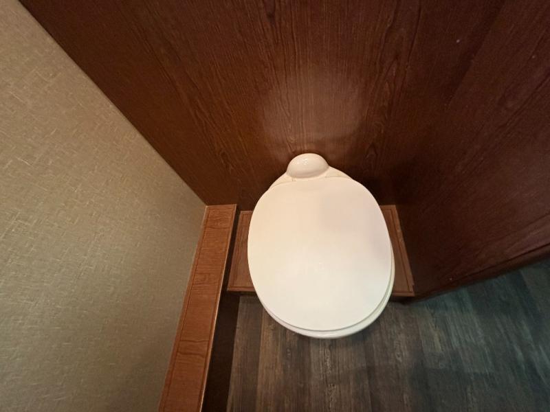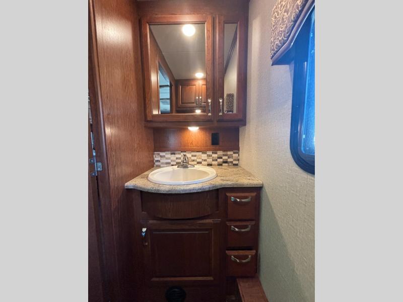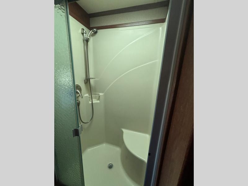 The bathroom is split with a private toilet area, sink, and medicine cabinet on one side of the motor home. Across from the toilet area there is a shower.