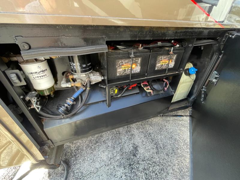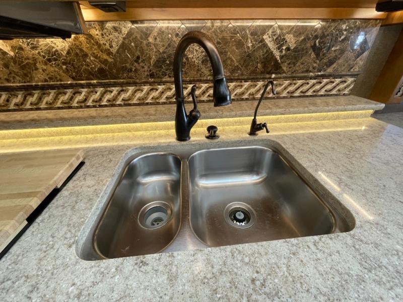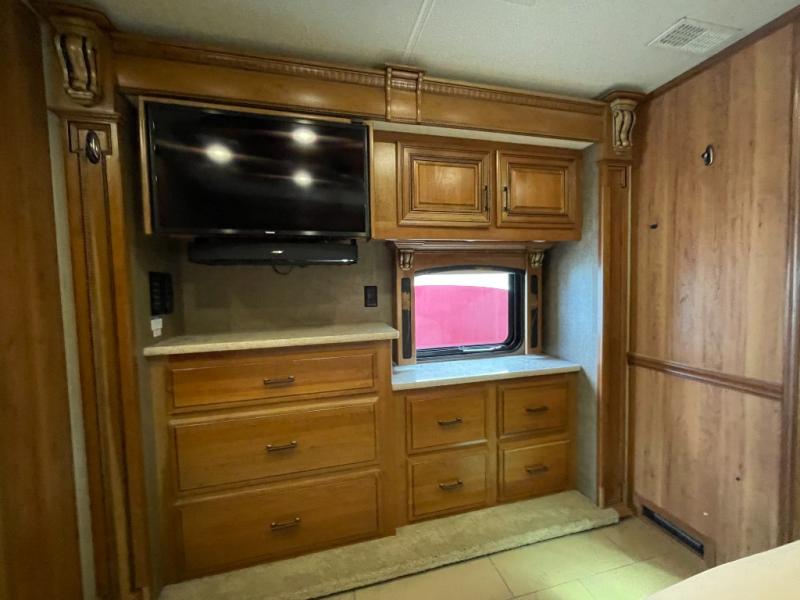 As you enter the passenger side of the motor home, to your left is a slide featuring a hide-a-bed, dinette with chairs, a desk, overhead cabinet, shelf, refrigerator, and two pantries. The opposite side of the motor home offers a slide with an entertainment center with fireplace and a 50" LED TV, countertop space, double kitchen sink, two burner range, microwave, and plenty of overhead storage. You will also enjoy the 32" LED TV above the driver and passenger's seat.