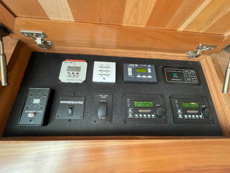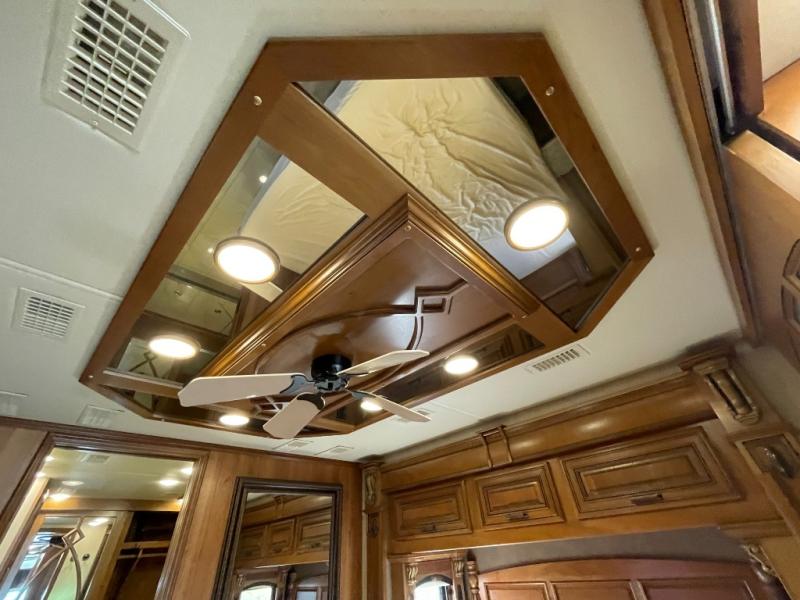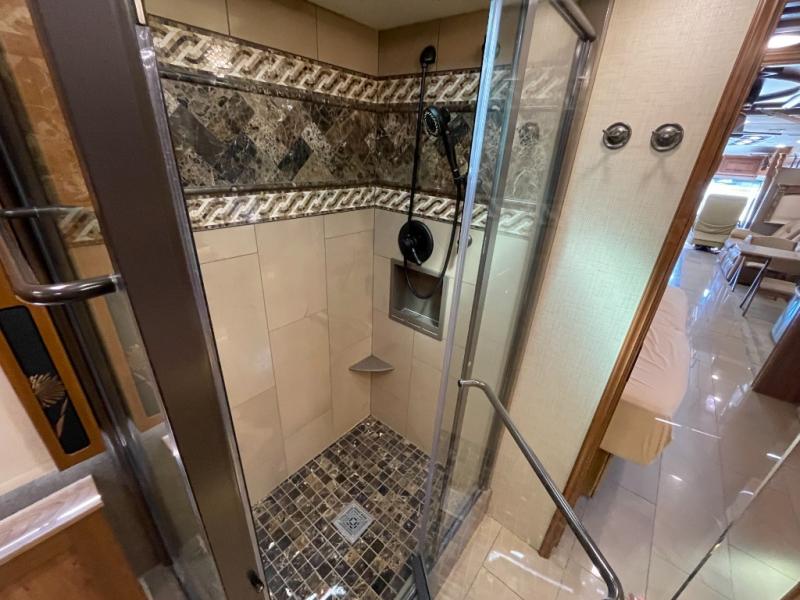 In the rear of the coach there is the master bath featuring a shower, a toilet, vanity sink, medicine cabinet, and a washer/dryer. Along the entire rear wall you will find a wardrobe with sliding mirror doors.