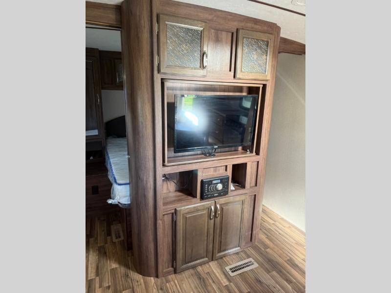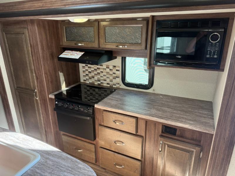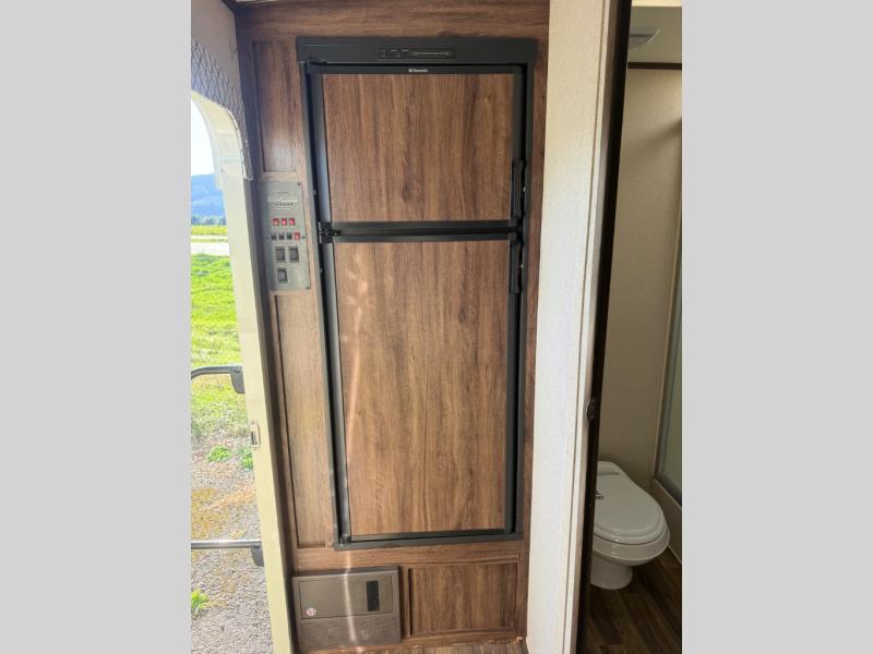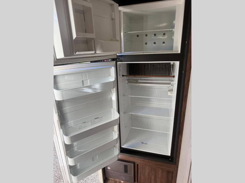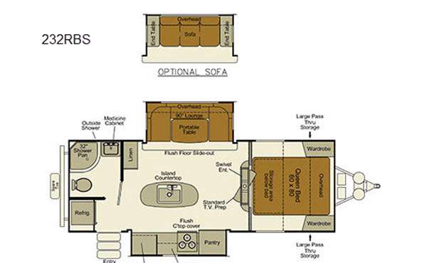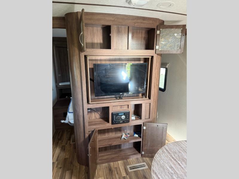 Stepping inside the travel trailer, to the left there is a refrigerator. To the right of the entrance you will find a slide with a microwave, three burner range, and pantry. The opposite side of the trailer offers a u-dinette slide with a portable table, or you can choose an optional sofa. Next to the dinette you will find a linen cabinet. In the middle of the kitchen area there is an island with extra counter space and a large sink. Along the front wall in the main living area there is a swivel entertainment center with a standard TV prep.