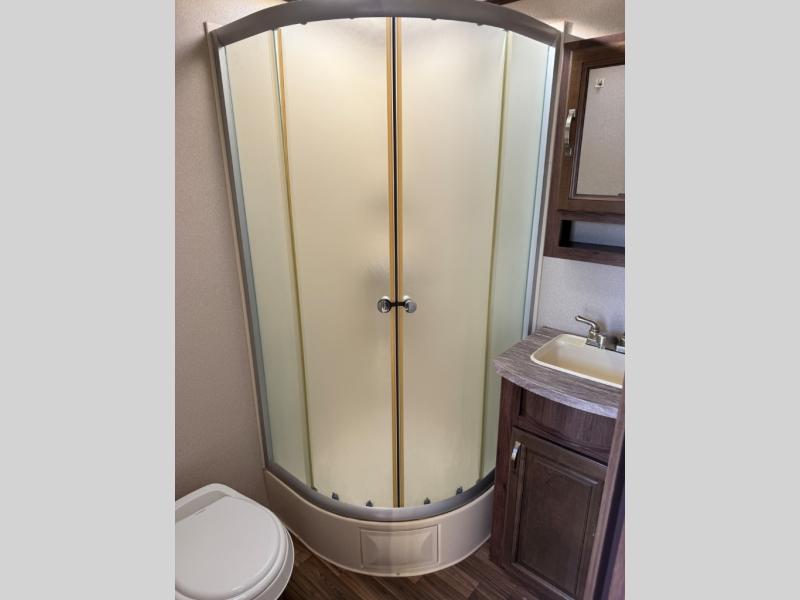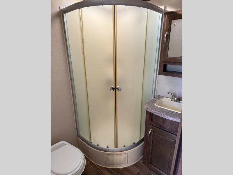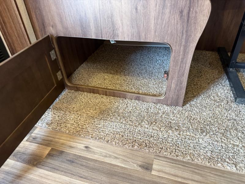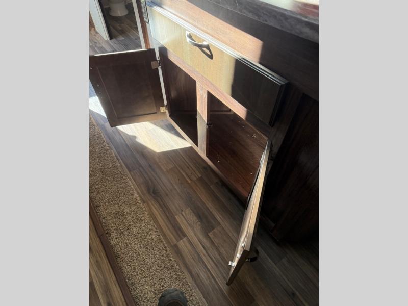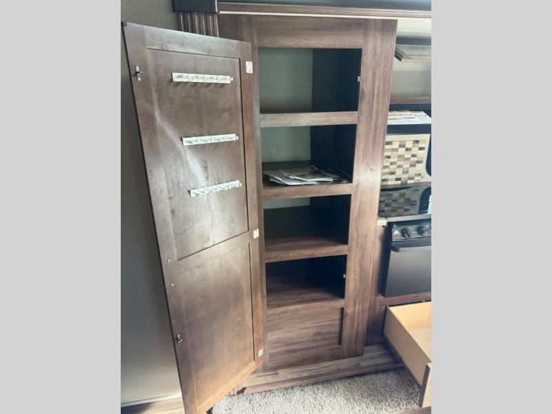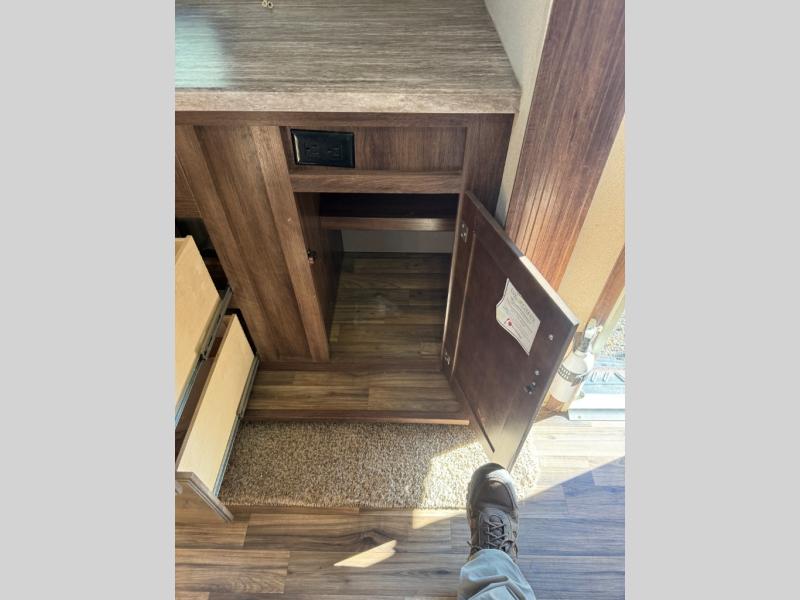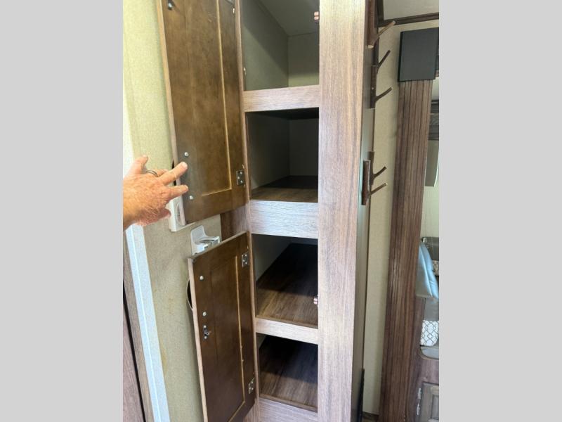 You will find plenty of storage throughout the travel trailer as well as a large pass thru storage area. There is even an outside shower for quickly cleaning up, plus more.