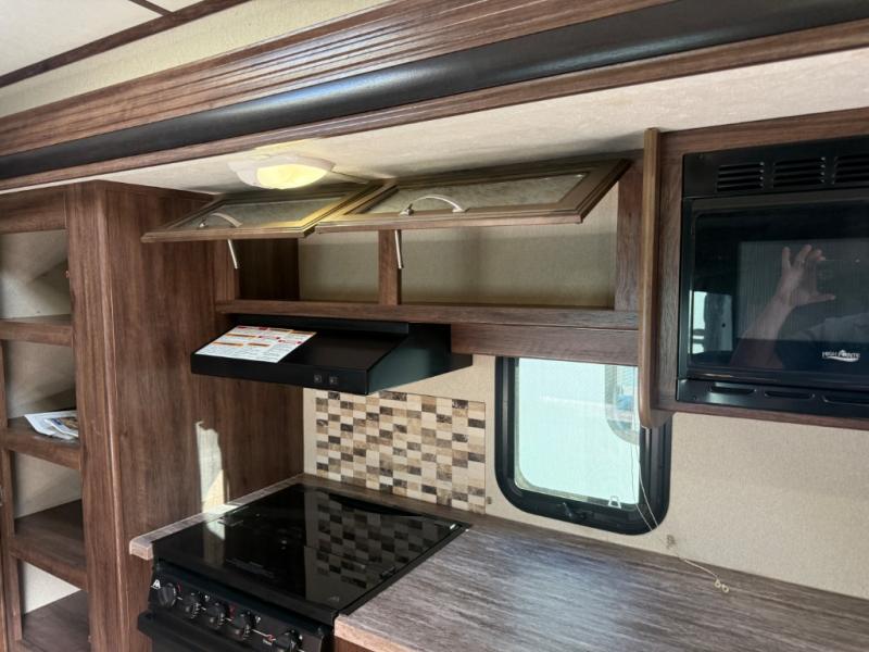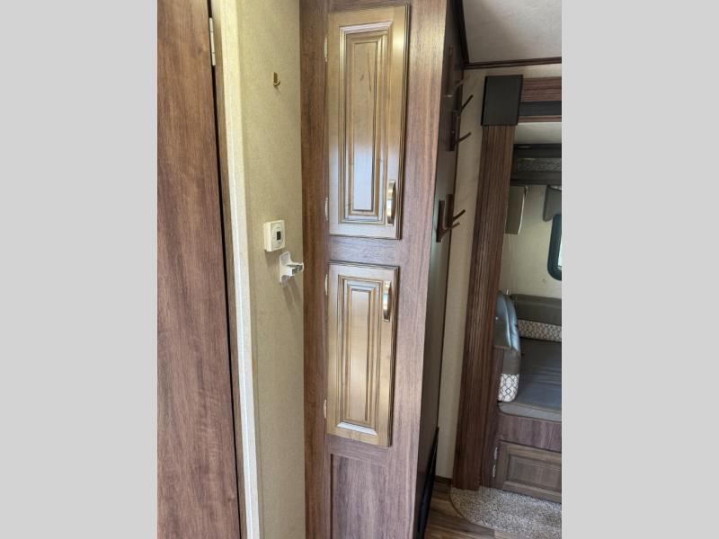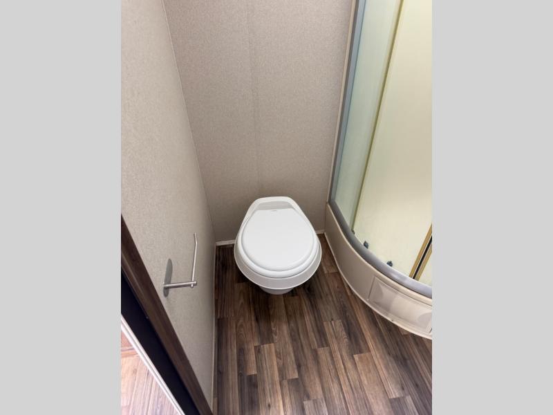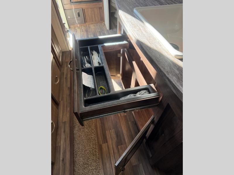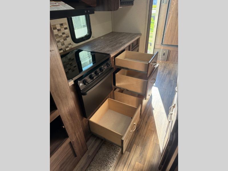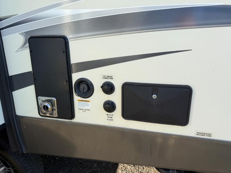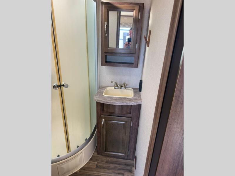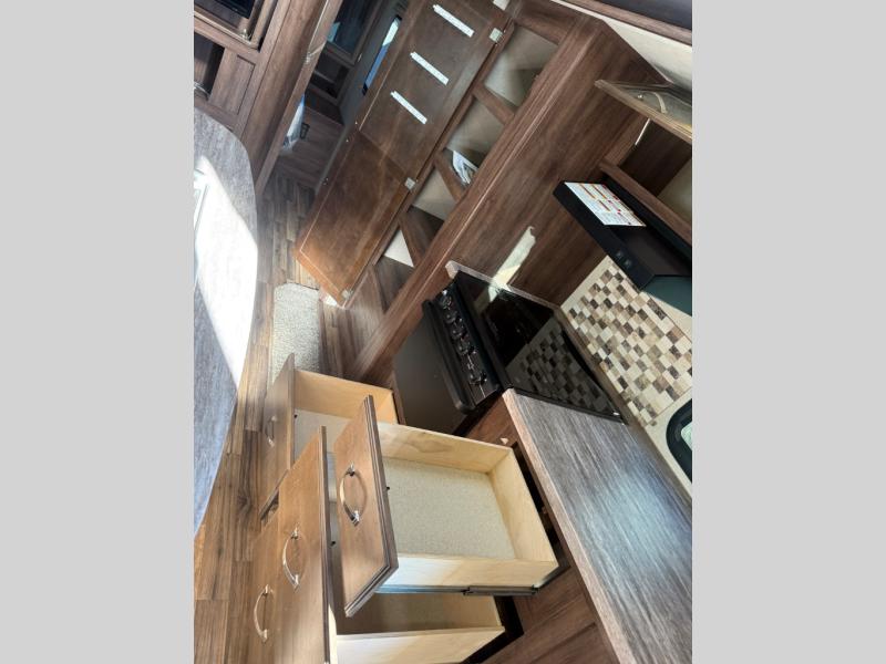 You will find plenty of storage throughout the travel trailer as well as a large pass thru storage area. There is even an outside shower for quickly cleaning up, plus more.