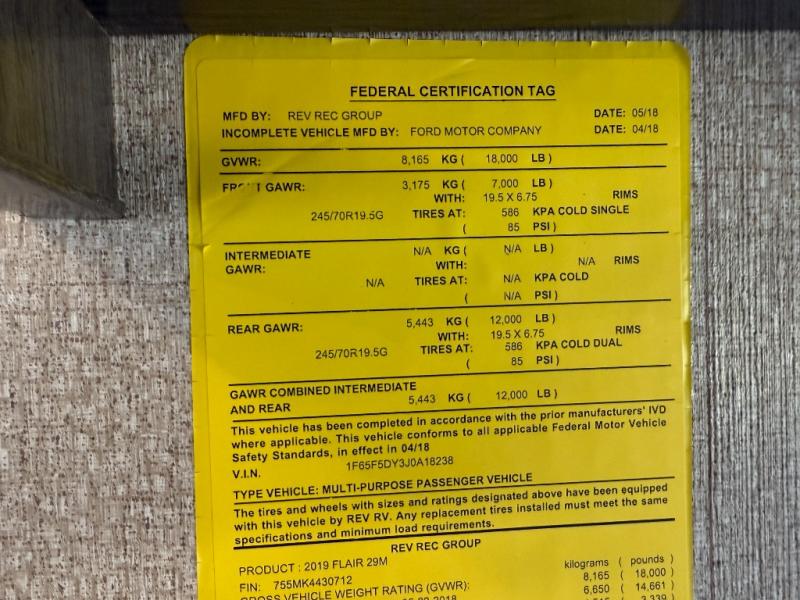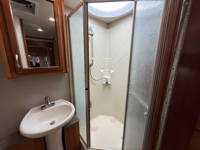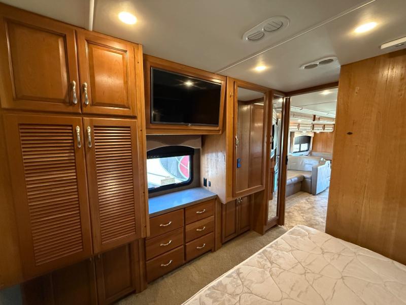 The Bounder 33C Fleetwood motor home features two slides for added space. In the rear of the motor home, you will find a private bedroom with a queen size bed and nightstand slide, double wardrobes, a dresser, and a 32" LED TV.