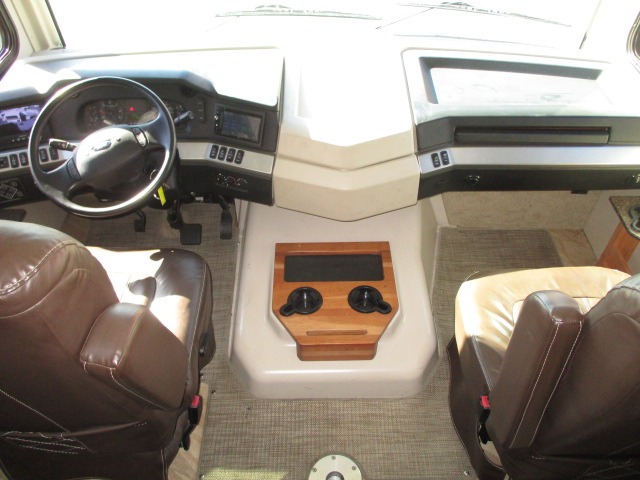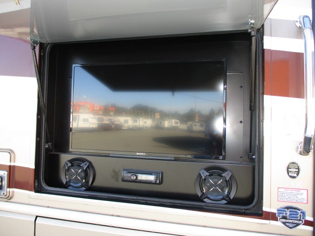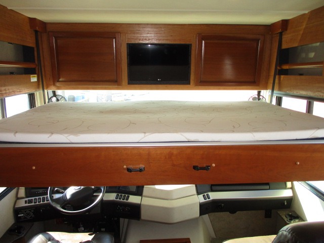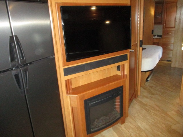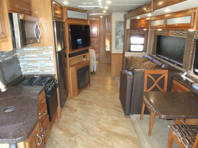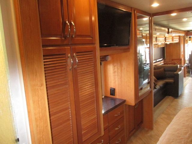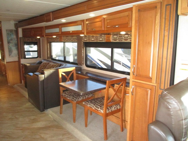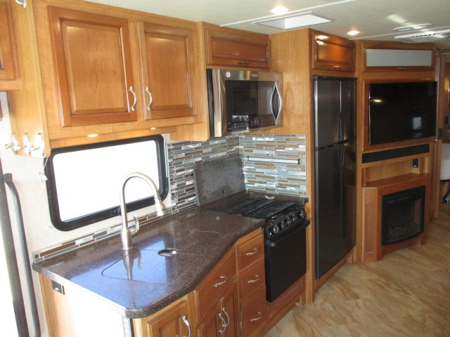 There is plenty of storage with all of the overhead cabinets in this motor home. You also have many options available to you such as, a front 32" LED TV, exterior entertainment center, three burner range with oven, washer and dryer, electric fireplace, residential refrigerator, hide-a-loft drop down queen bed, facing dinette, and a free-standing dinette with credenza.