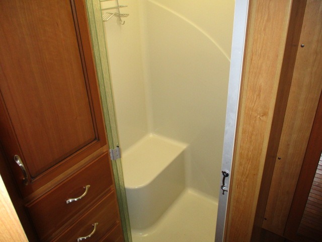 In the rear of the motor home, you will find a master bathroom with a toilet, medicine cabinet, sink, linen cabinet, and shower. The bedroom offers a queen size bed and nightstands slide, double wardrobes, a dresser, and a 32" LED TV. As you leave the bedroom, a half bath is located to the right.