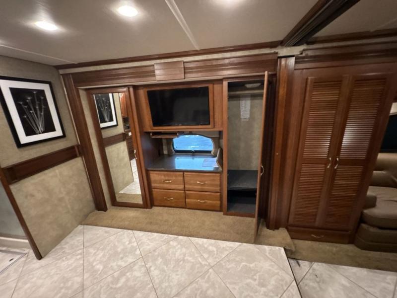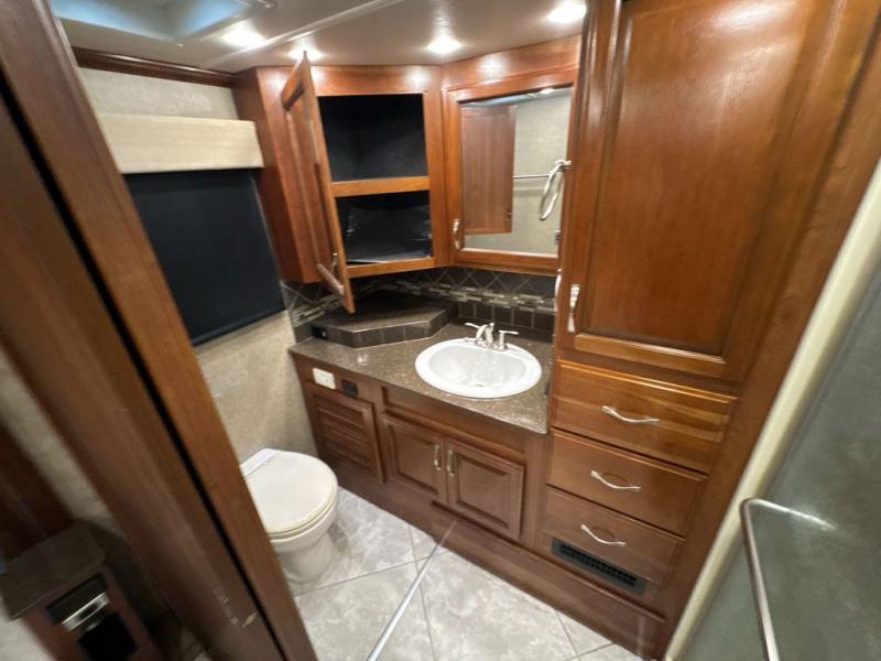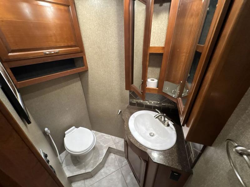 In the bedroom across from the wardrobes you will find a slide with a king Exclusive Dream Easy Series. In the very rear of the motor home there is a nice master bathroom with a toilet, sink, linen cabinet, and shower with seat. As you leave the bedroom and proceed toward the front of the motor home you will find a convenient half bath.