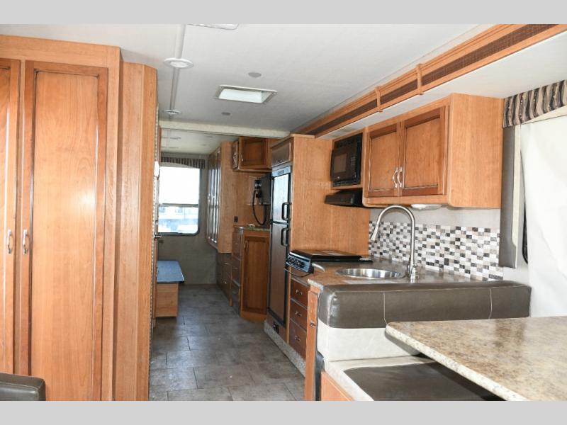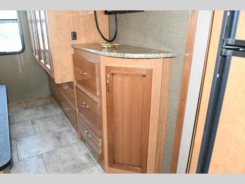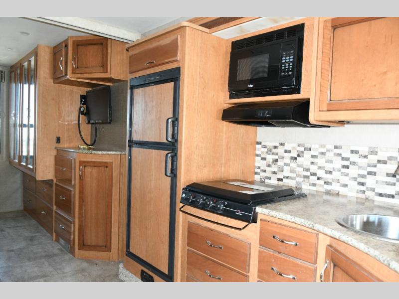 The kitchen makes meal prep easy with a three-burner range, overhead microwave, round stainless sink, refrigerator, and ample counter and cabinet space. A pantry keeps your dry goods organized for longer trips. -