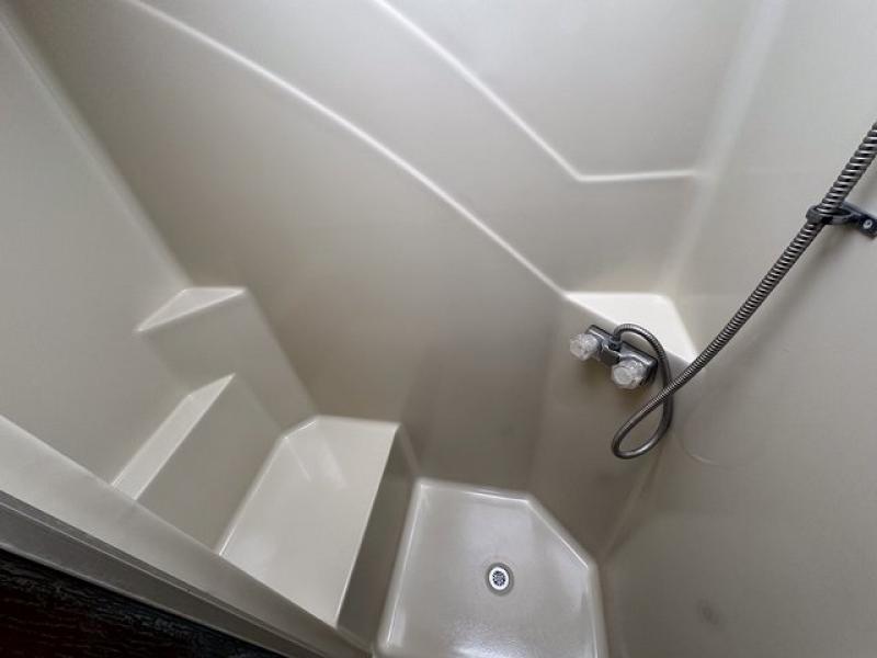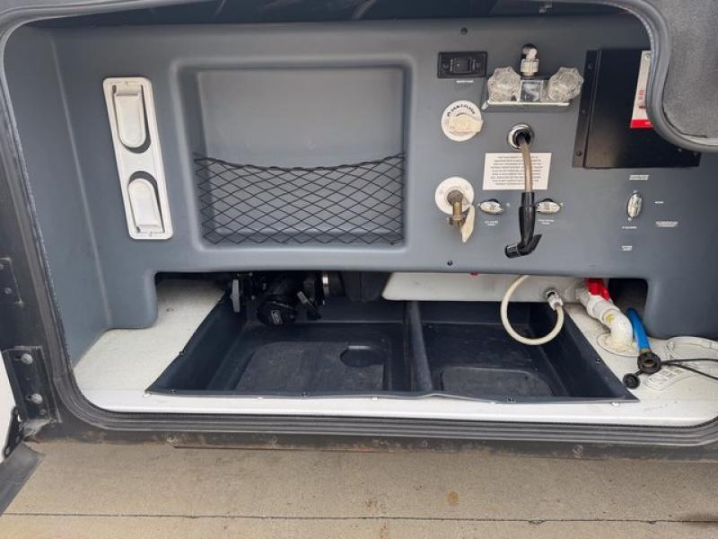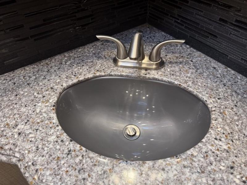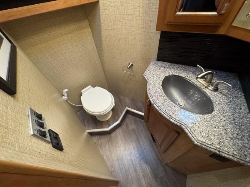 Mid coach you will find a convenient half bath with toilet and sink along the curb side. Just outside the bathroom door along the angled bath wall is a 42" LED TV and fireplace. The perfect addition for evenings when you just want to cozy up inside and enjoy a movie or relaxing time with a bit of ambiance that a fireplace provides.