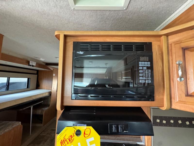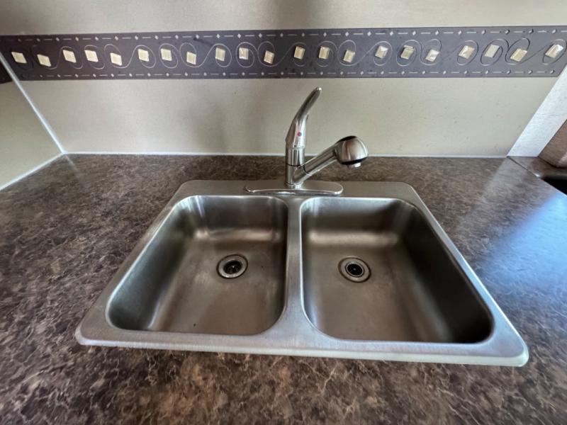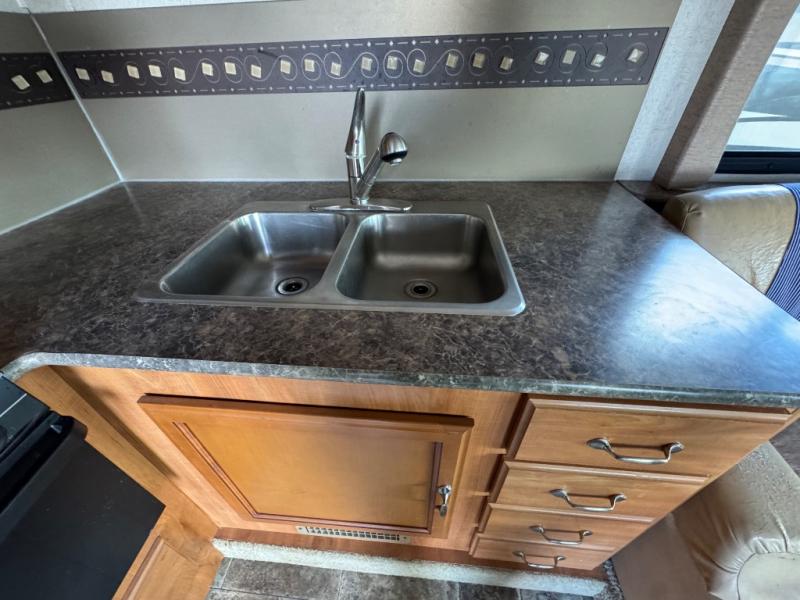 As you enter the motor home, to the left there is a refrigerator. From the entry door, to the right, you will find a sofa bed that is perfect for your overnight guests. The opposite side of the motor home has a slide with a 42" x 70" dinette, a three burner range, and overhead microwave oven. Next to the slide you will find a double kitchen sink with storage cabinets above the sink. Just around the corner from the sink there is a pantry for all of your dry and canned food items.