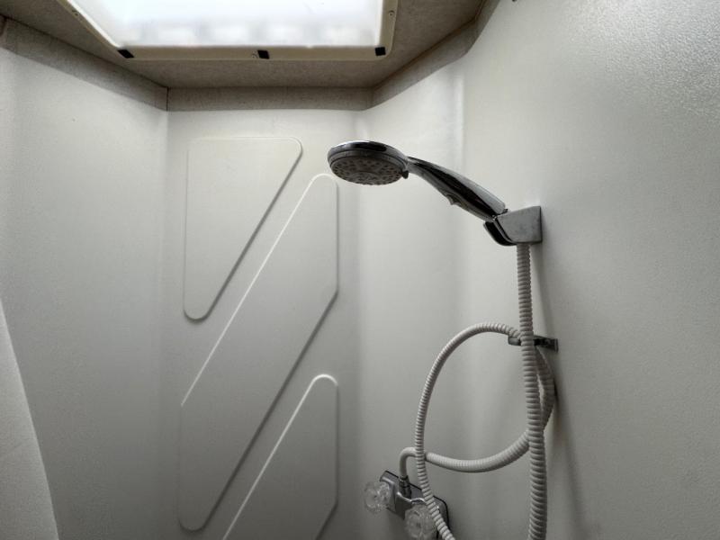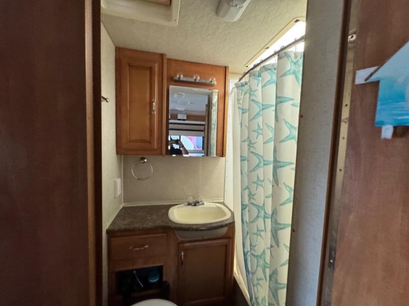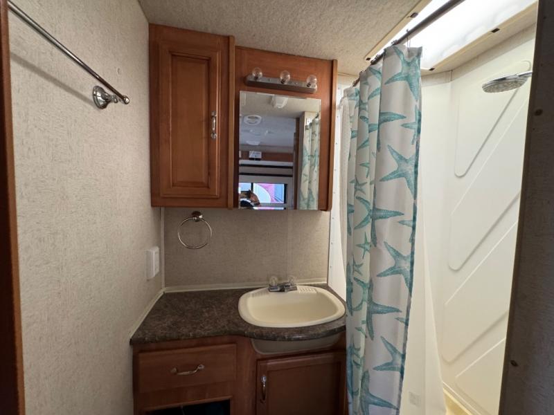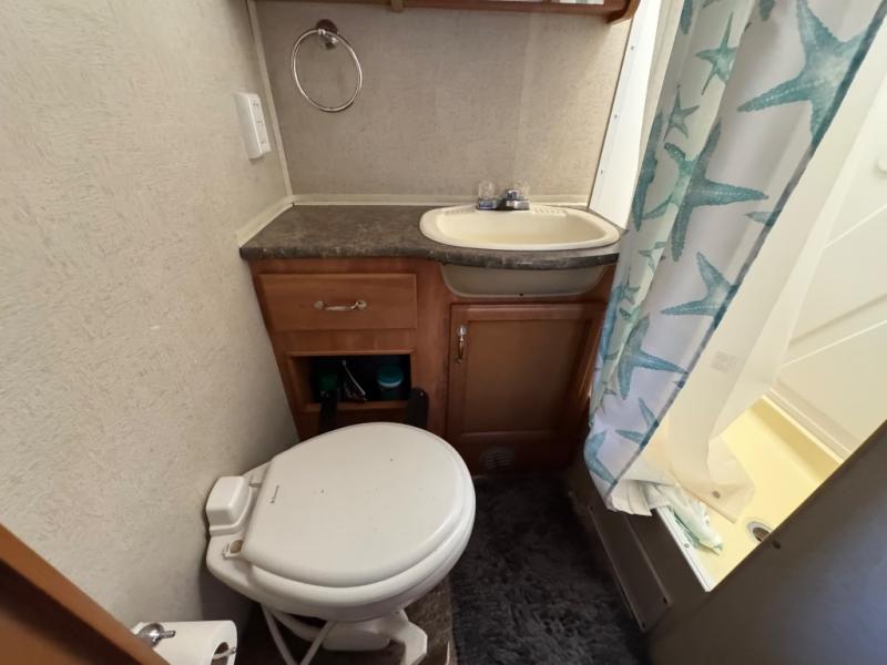 As you continue toward the rear of the motor home, there is a side aisle bath on the right. Inside the bath you will find a shower, vanity with sink, and toilet.