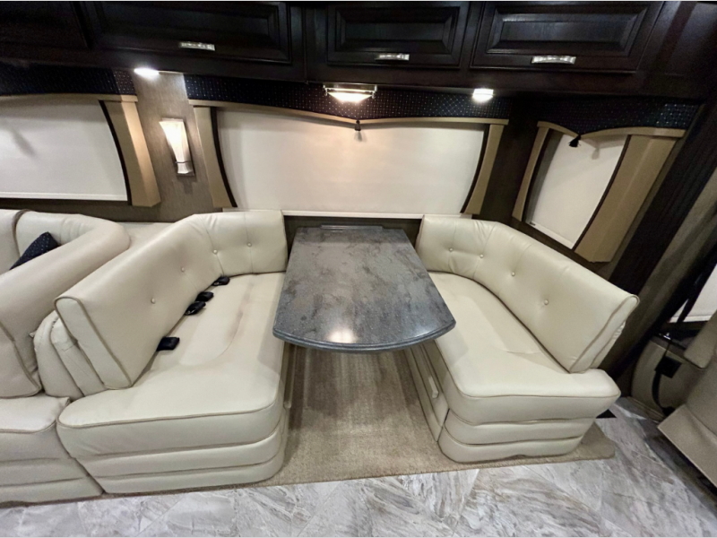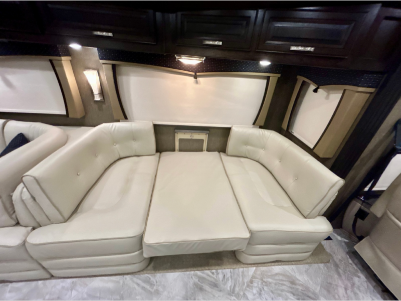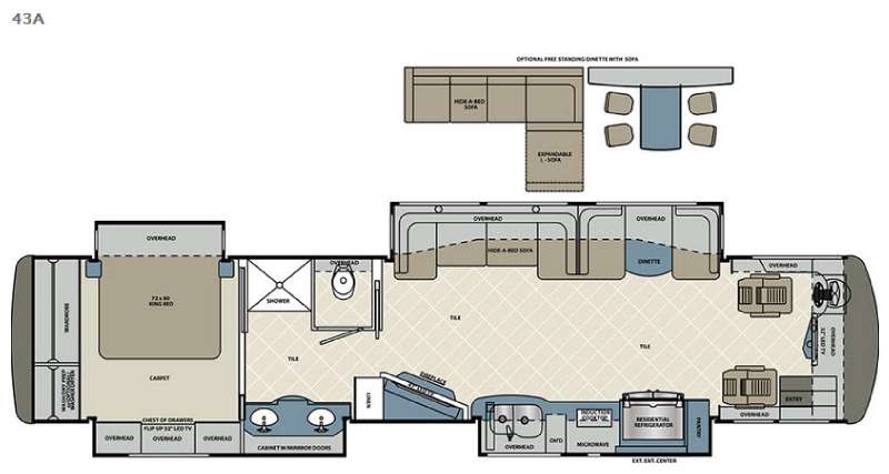 Enter in front of the passenger seat and be greeted by a combined kitchen and living area looking back. There is an overhead 32" TV above the cab. Along the road side a large slide out contains a hide-a-bed sofa and a booth dinette, both with overhead cabinets above. In place of the dinette you can choose an optional hide-a-leaf free standing table, an you can also choose an optional expandable l-sofa.