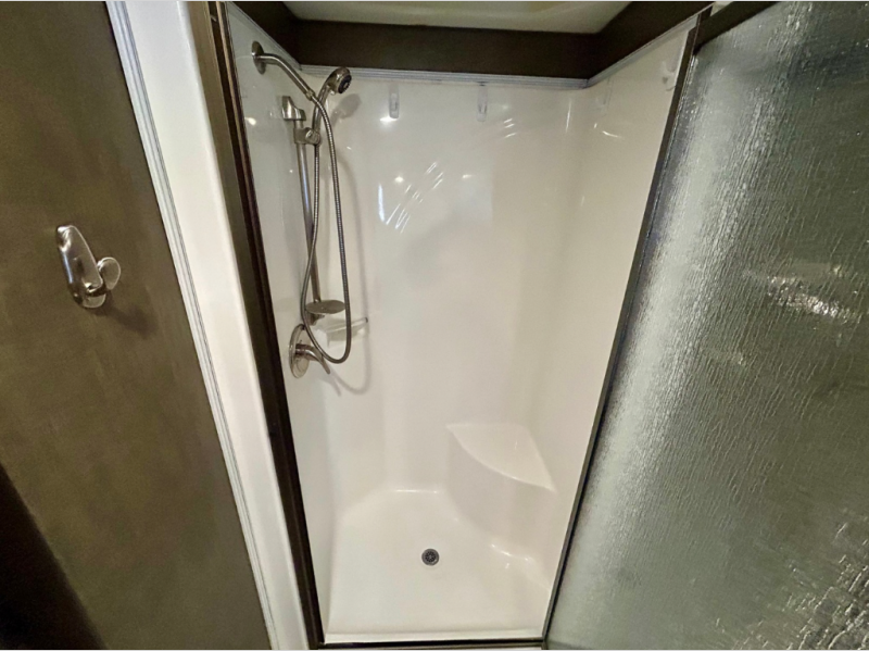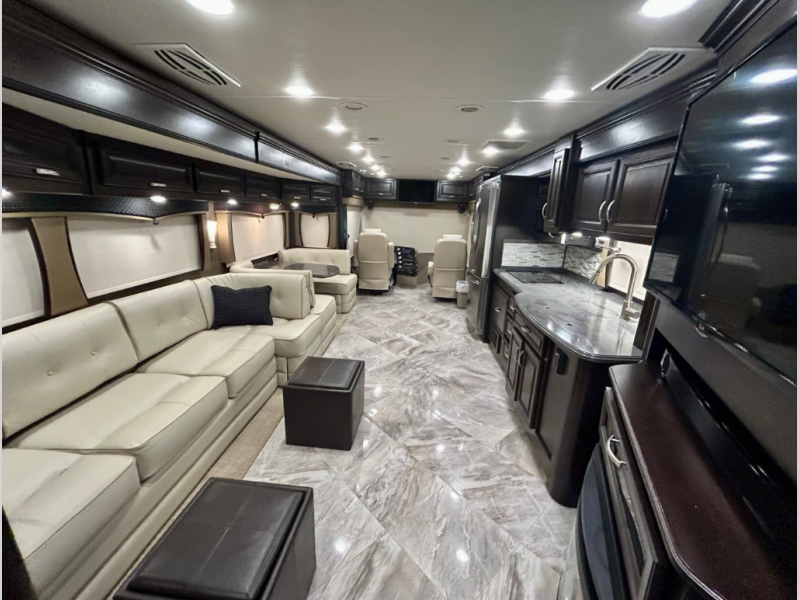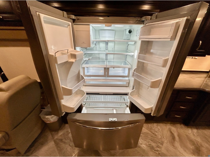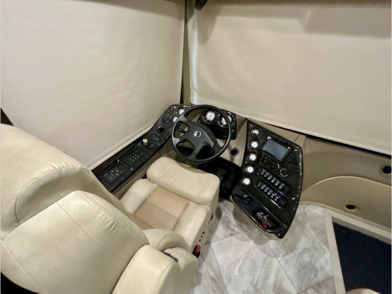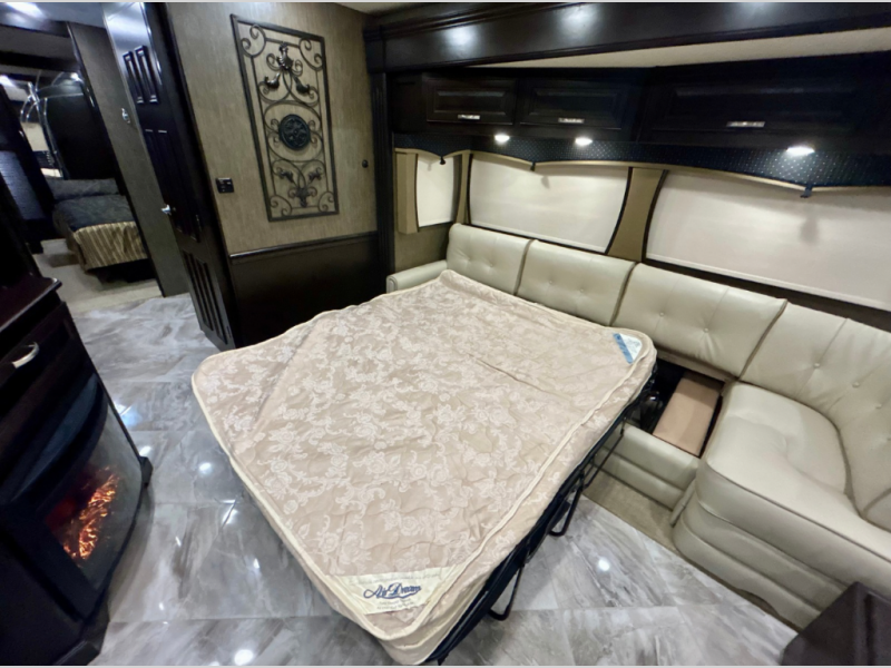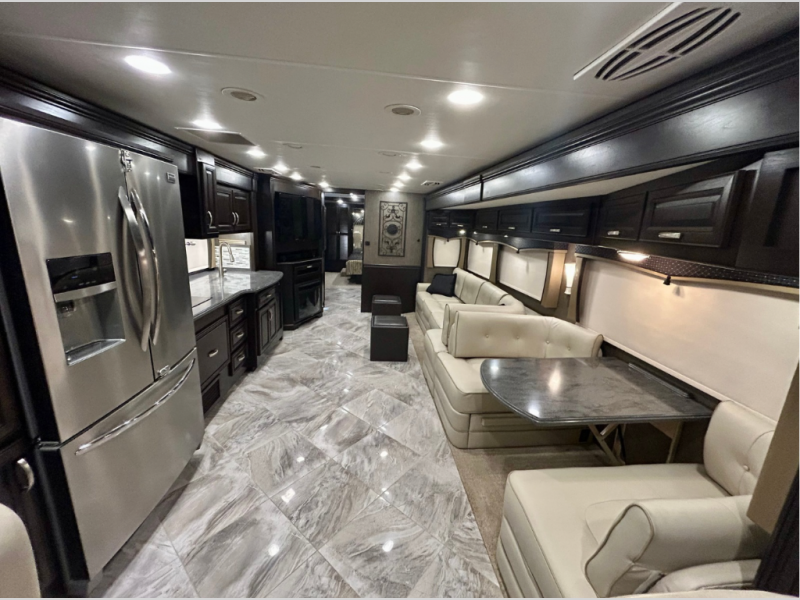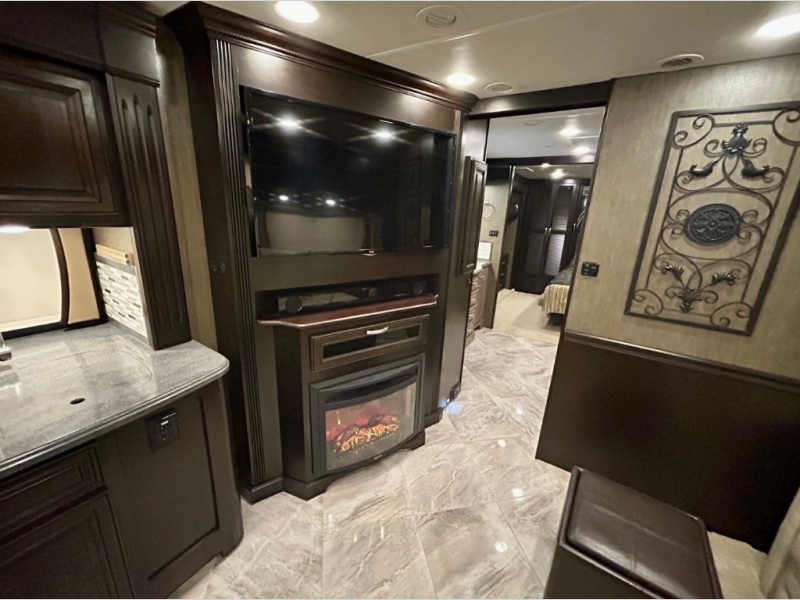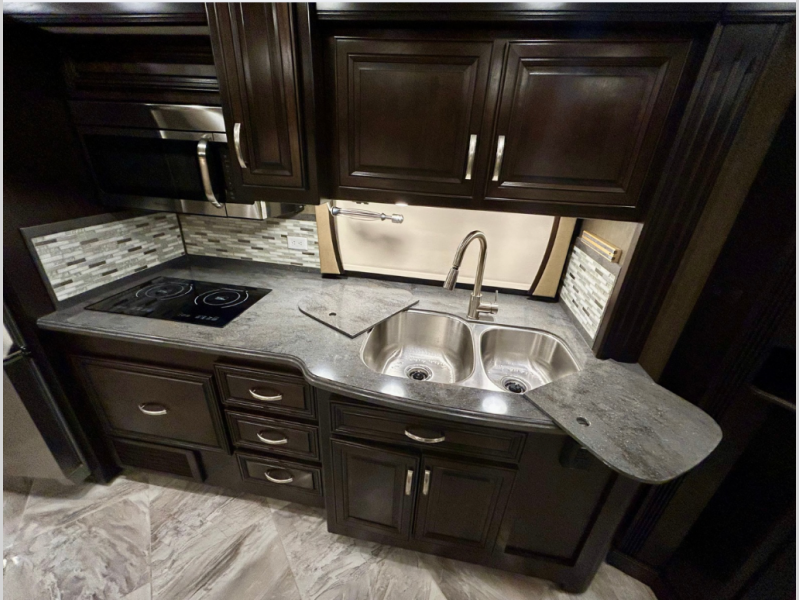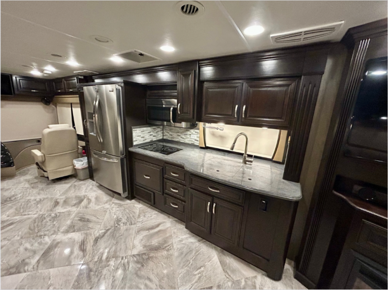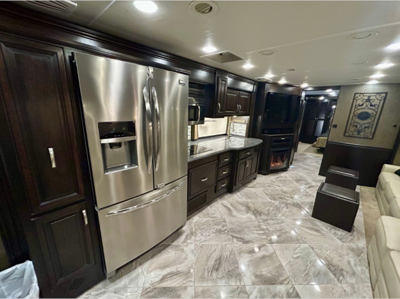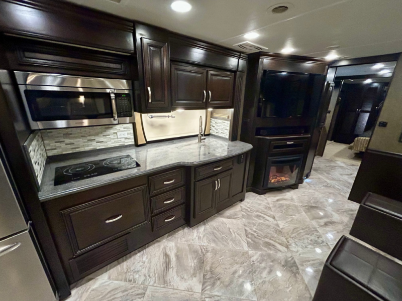 On the opposite side, behind the passengers seat, you will find a slide that features a pantry, residential refrigerator, cooktop, microwave, double kitchen sink, and a fireplace with a 49" TV.