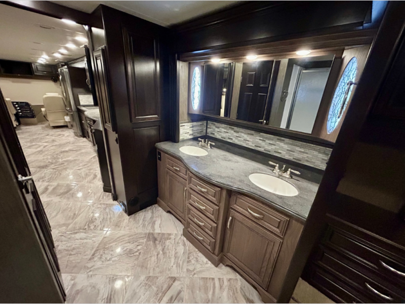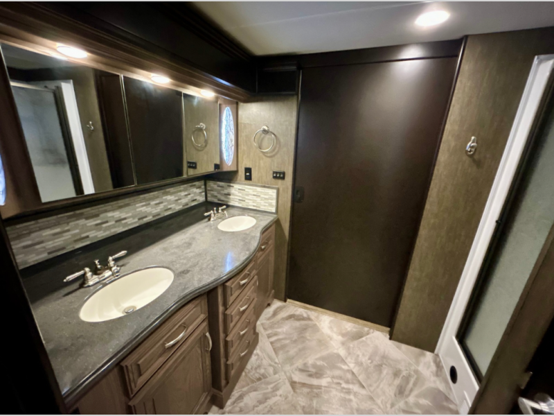 Around the corner you will find a walk-thru bathroom. Along the road side there is a private toilet area and a shower. The opposite side has his/her sinks, and a cabinet with mirrored doors.