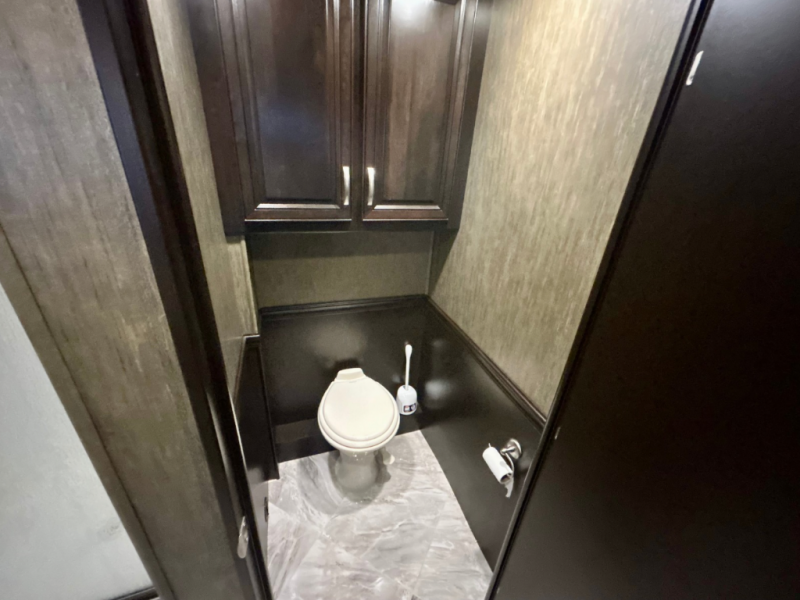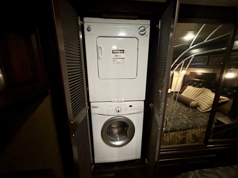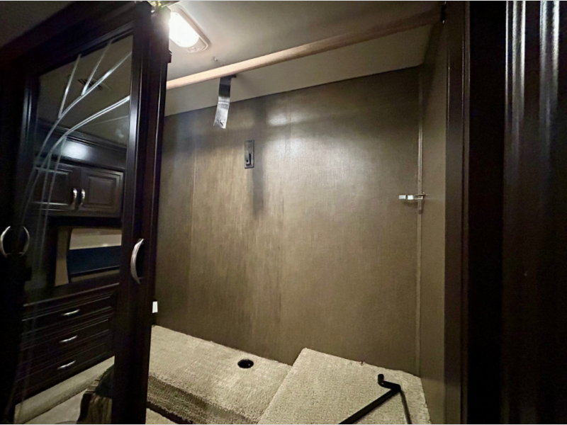 In the rear bedroom there is a slide out king size bed including nightstands and an overhead cabinet for storage. The closet along the rear wall features plenty of space for hanging clothes, plus one corner storage cabinet has been prepped for a washer and dryer option that you could choose. The slide opposite the king bed offers a chest of drawers with a flip-up 32" LED TV, and includes more storage on either side.