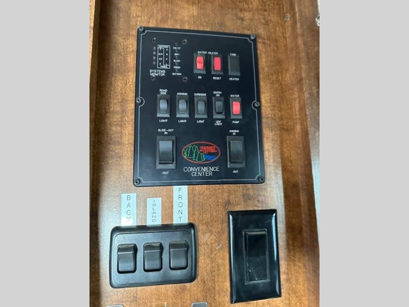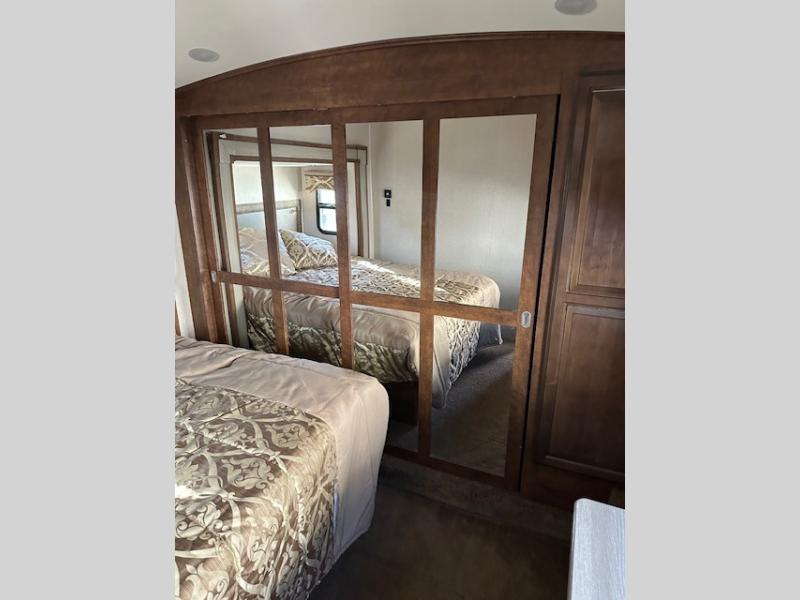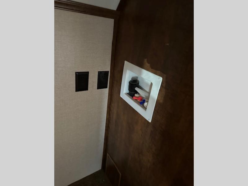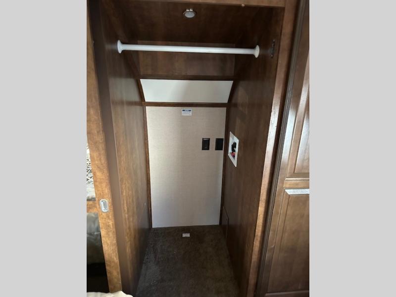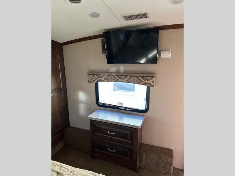 The front bedroom includes a queen bed slide. There is plenty of storage with a wardrobe and drawers along the front. Across from the bed there is a dresser and TV above. The bedroom also includes a closet with a washer and dryer for your convenience, plus so much more!