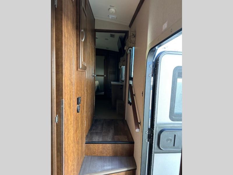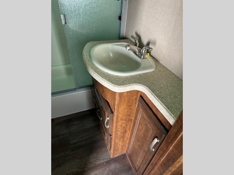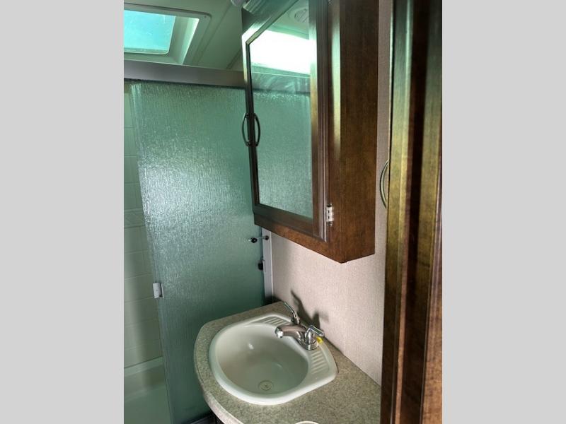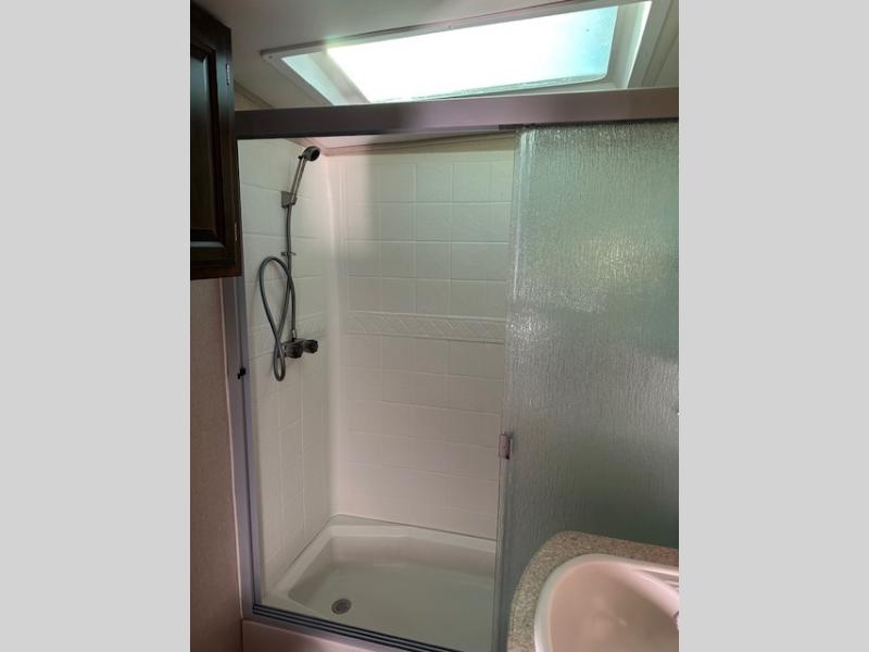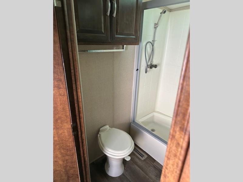 Heading to the front you will step up stairs to find the bathroom on the left side. Inside the bath, there is a toilet, shower, sink, storage, and a medicine cabinet.