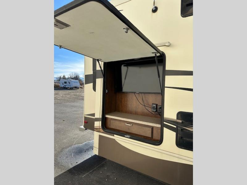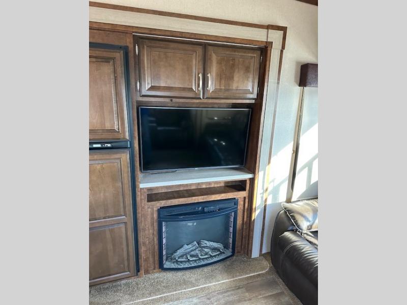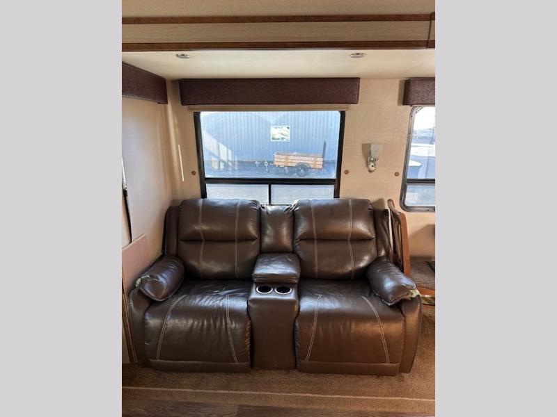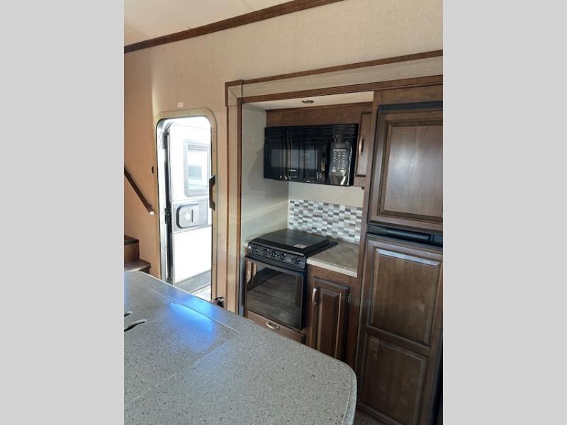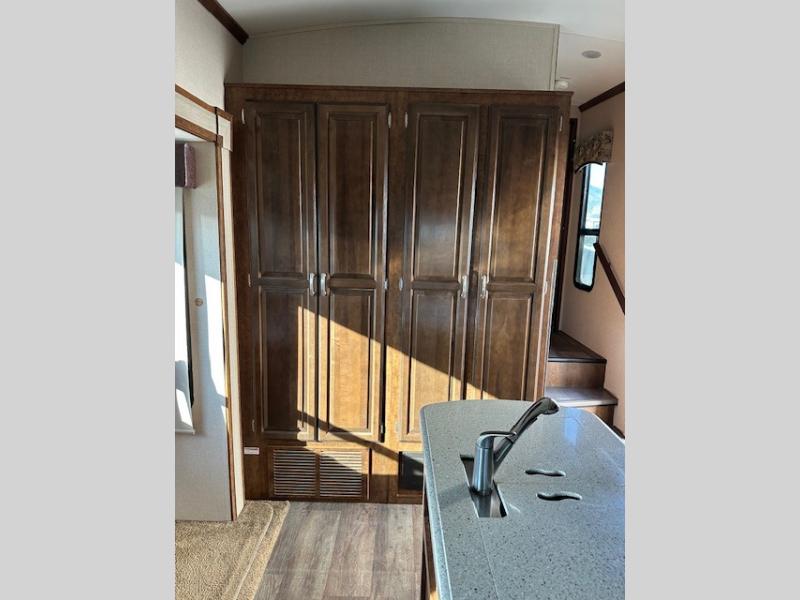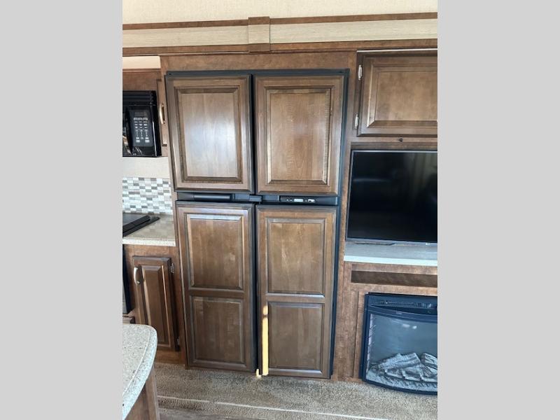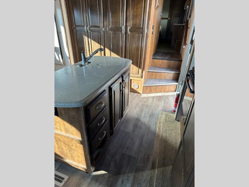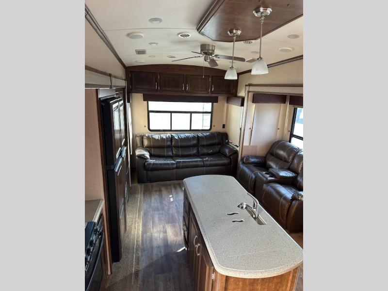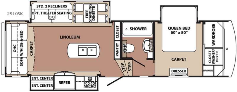 As you enter to your left is a slide out three burner range, microwave, refrigerator, and entertainment center. On the opposite side is a slide out free standing dinette, and two recliners, or you can choose optional theater seating in place of the recliners. In the rear you will find a hide-a-bed sofa with overhead cabinets. There is additional countertop space and a double sink in the kitchen island. A pantry for your non-perishables and a closet are on the interior wall facing the rear of the fifth wheel.