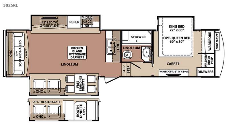 You can even choose a few options, such as theater seating and a booth dinette, and a queen bed.