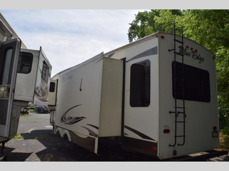 The Blue Ridge 3025RL fifth wheel by Forest River offers rear living area and triple slides.