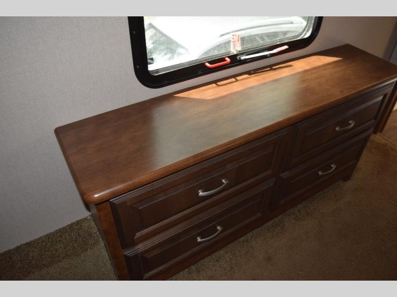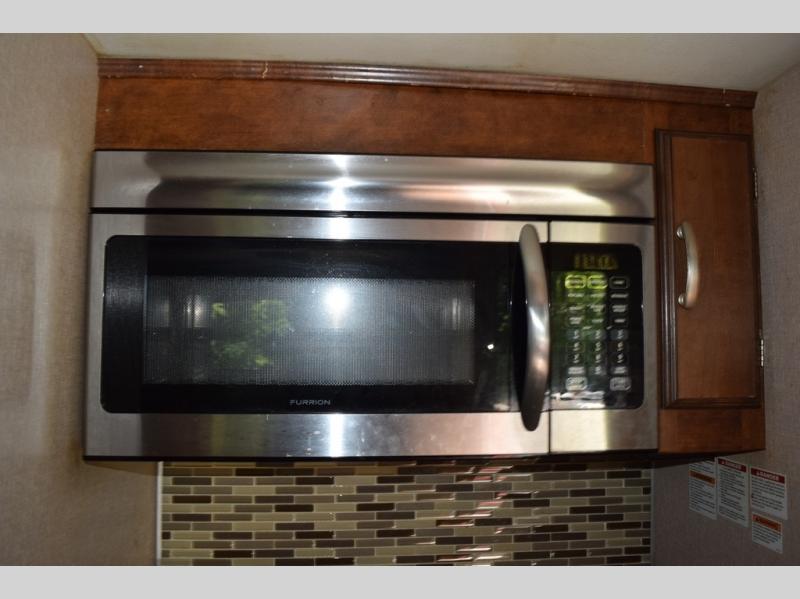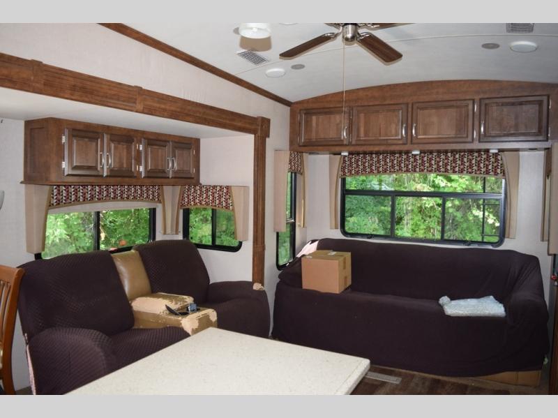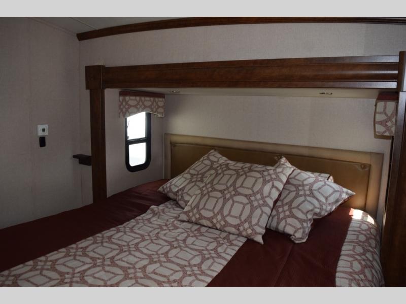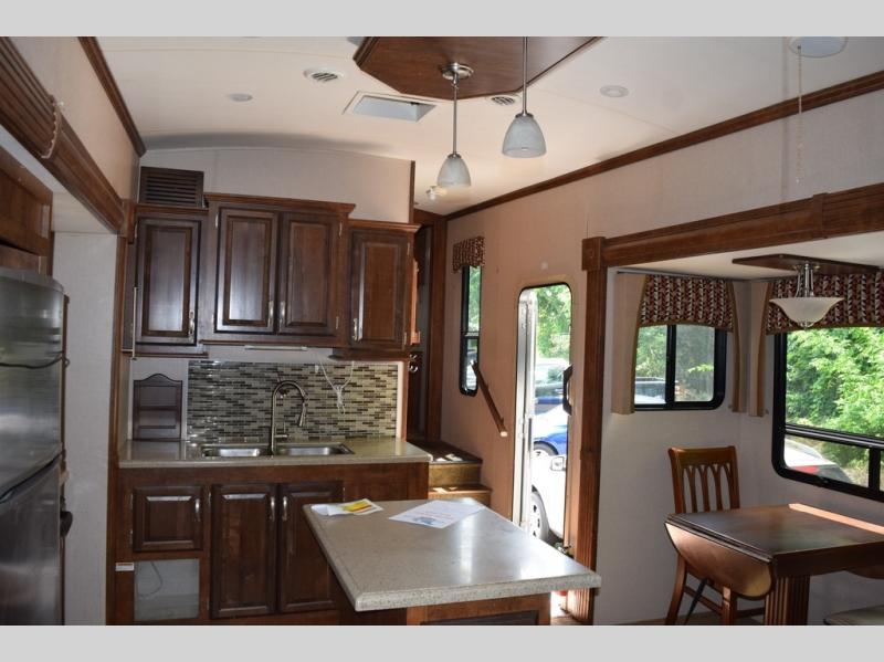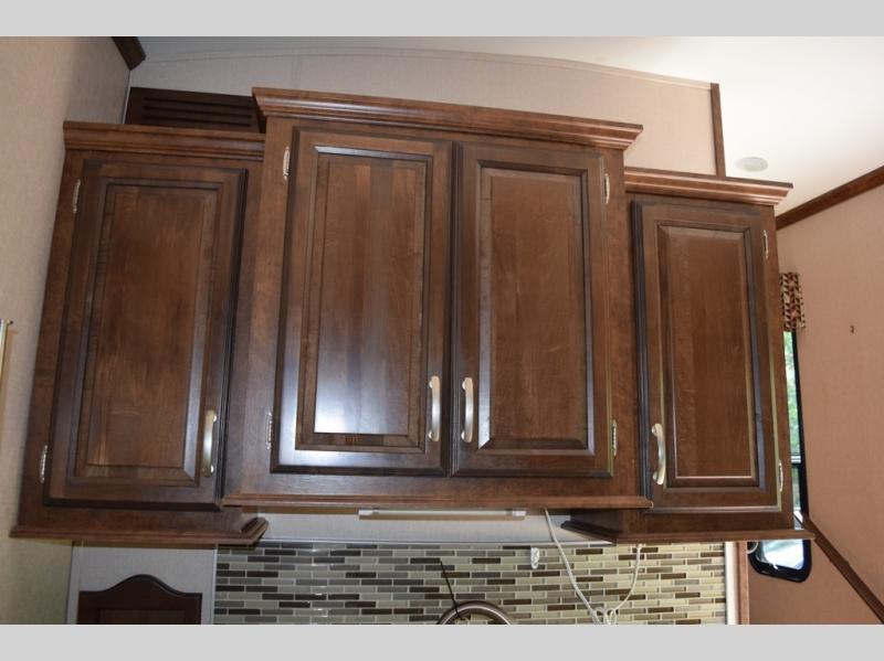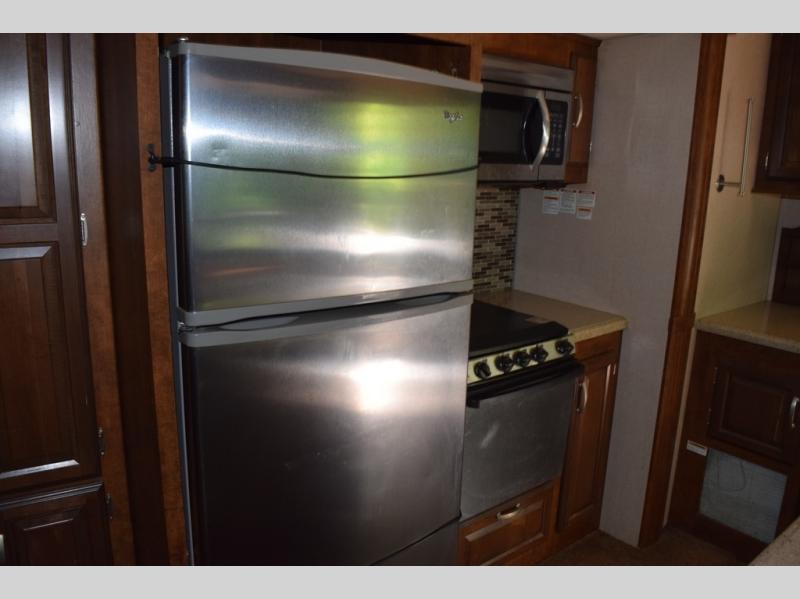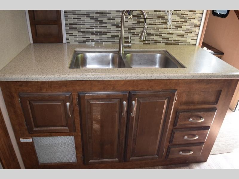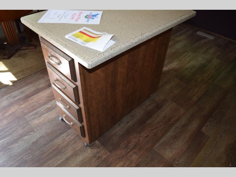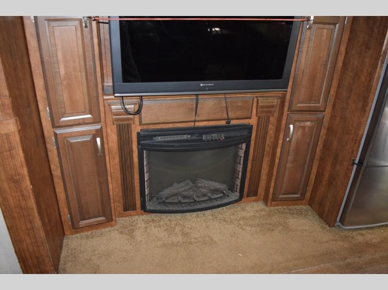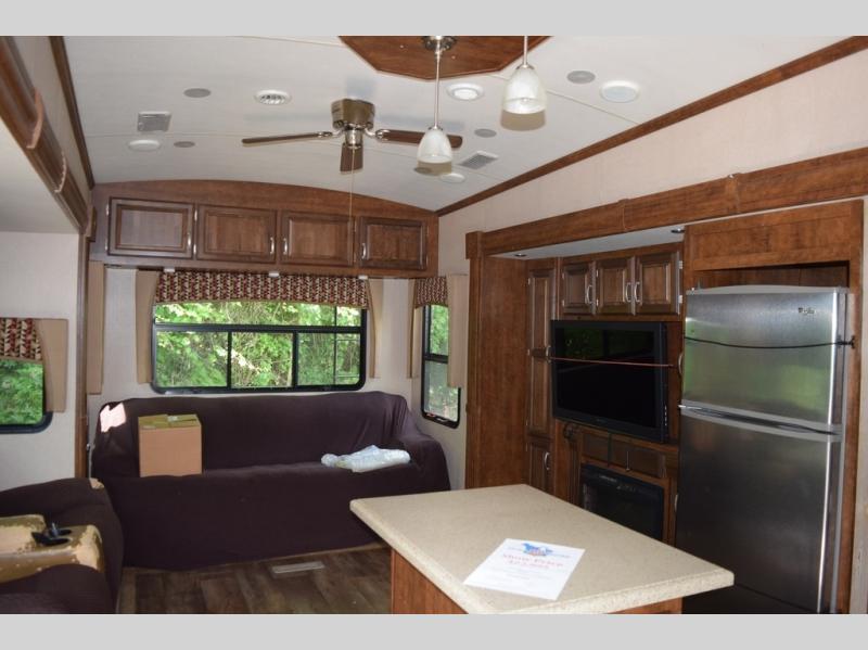 As you enter the model there are two slides in the rear of the fifth wheel. The first slide has a free-standing dinette and two lounge chairs. In the rear, you will find a hide-a-bed sofa. The other slide has a 42" LED TV, fireplace below the TV, refrigerator, three burner range, and microwave. The kitchen sink is along one wall surrounded by counter space. In the middle of the kitchen you will enjoy the kitchen island with storage drawers.