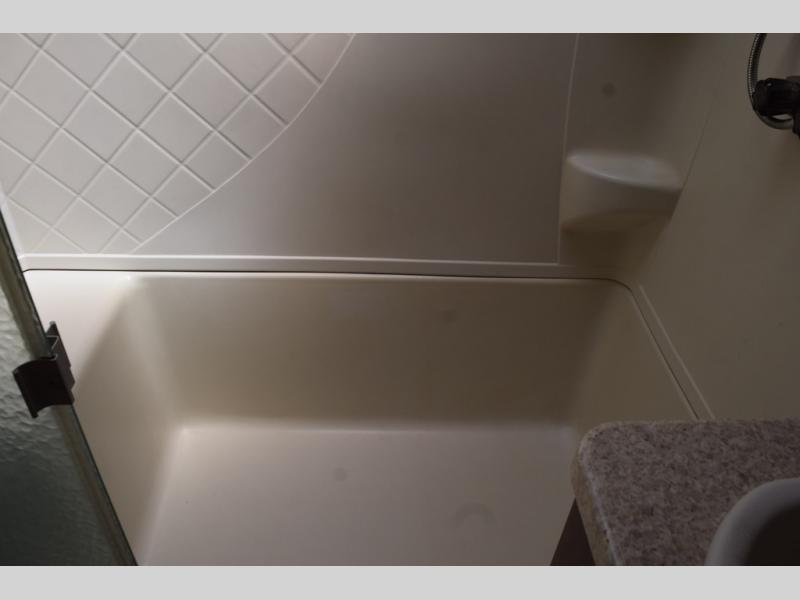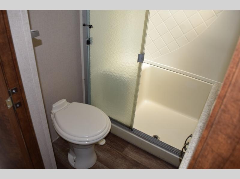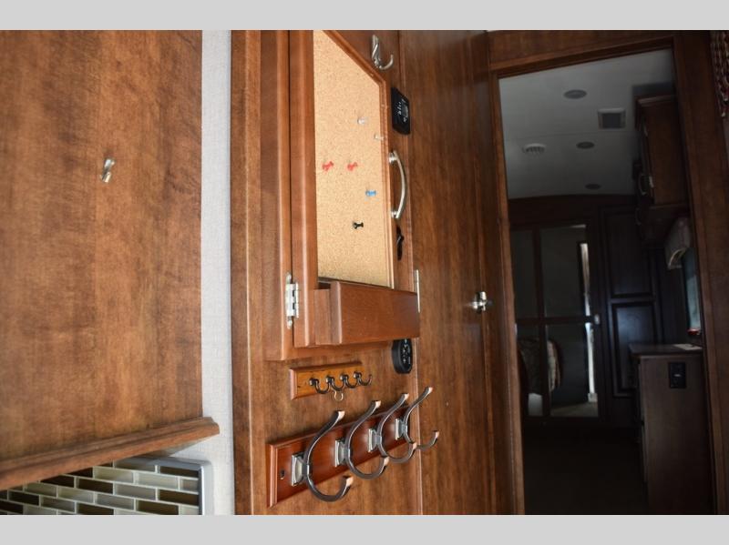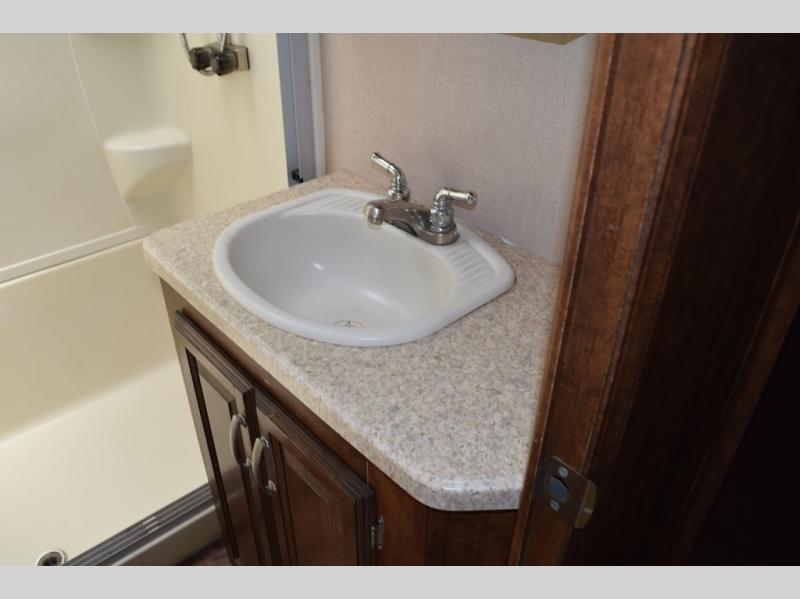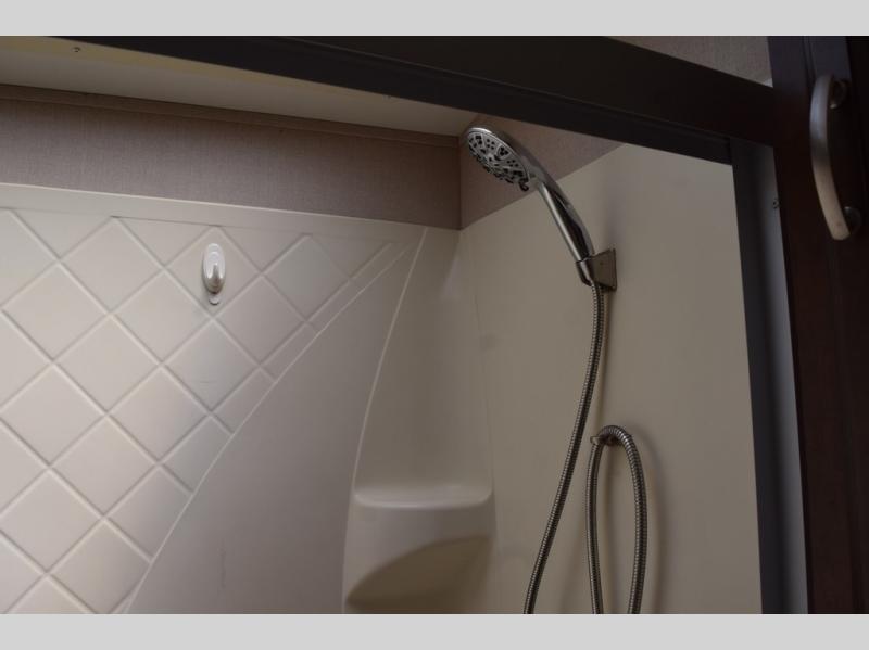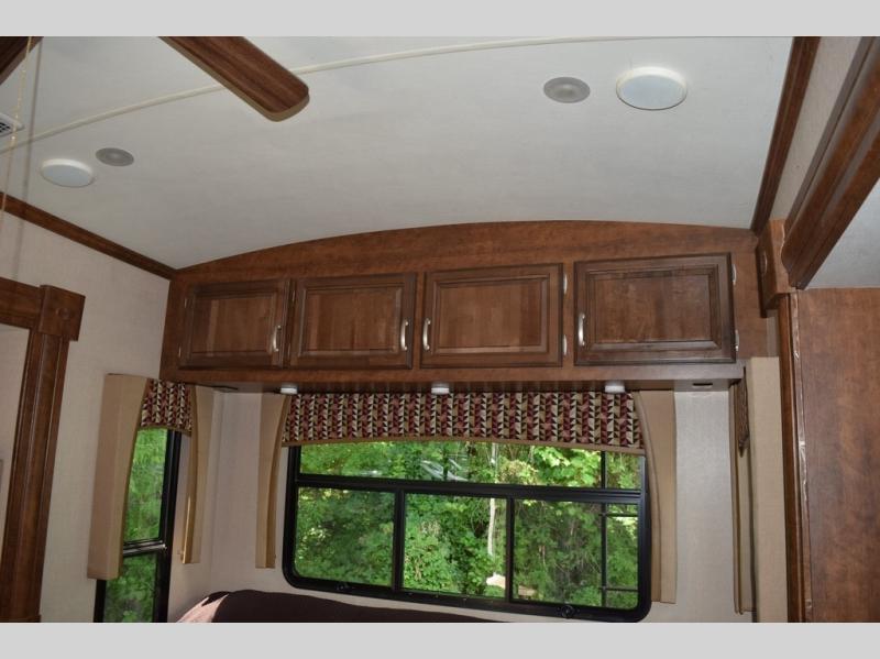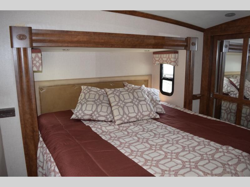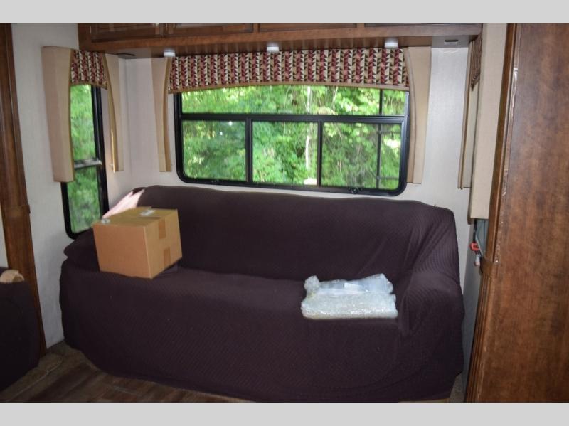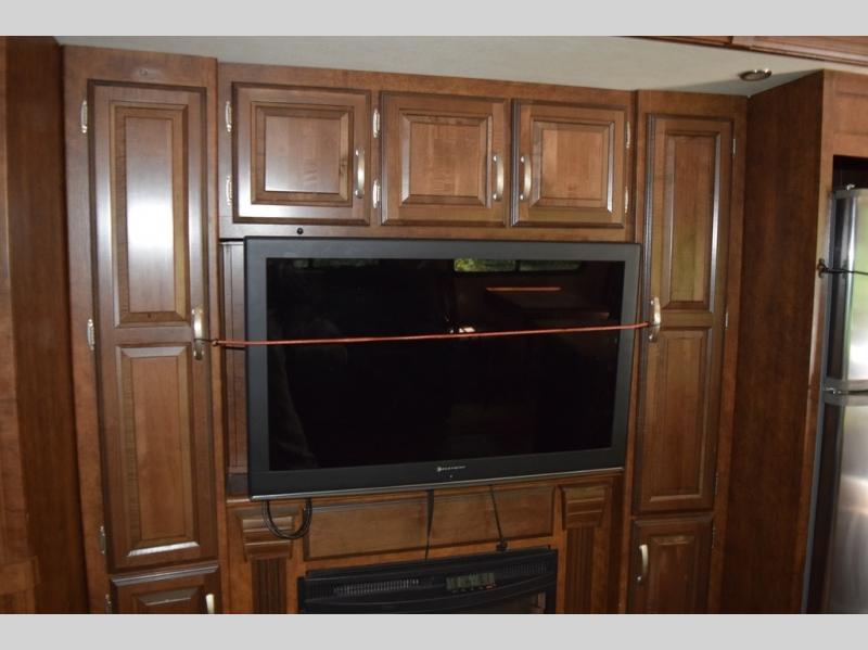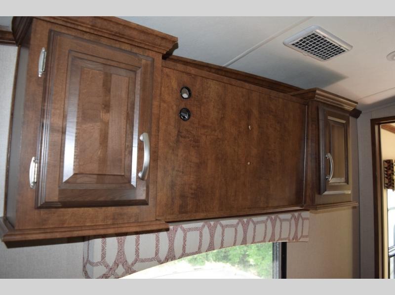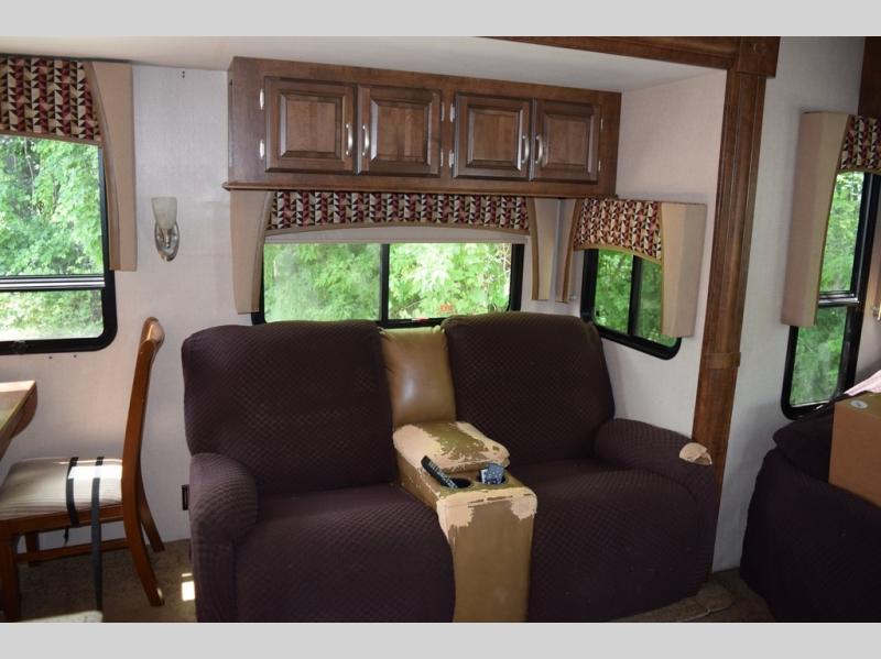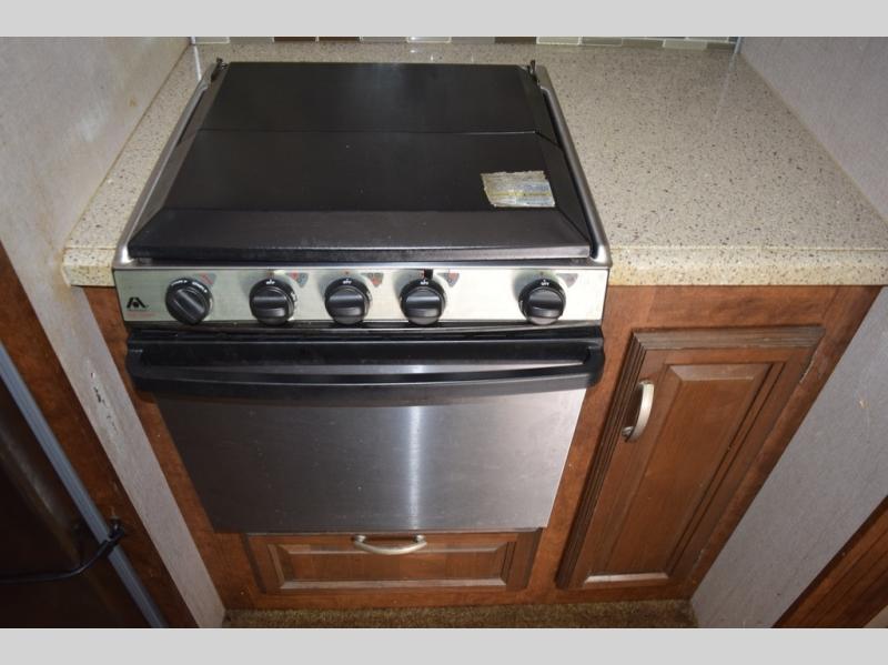 As you enter the model there are two slides in the rear of the fifth wheel. The first slide has a free-standing dinette and two lounge chairs. In the rear, you will find a hide-a-bed sofa. The other slide has a 42" LED TV, fireplace below the TV, refrigerator, three burner range, and microwave. The kitchen sink is along one wall surrounded by counter space. In the middle of the kitchen you will enjoy the kitchen island with storage drawers.