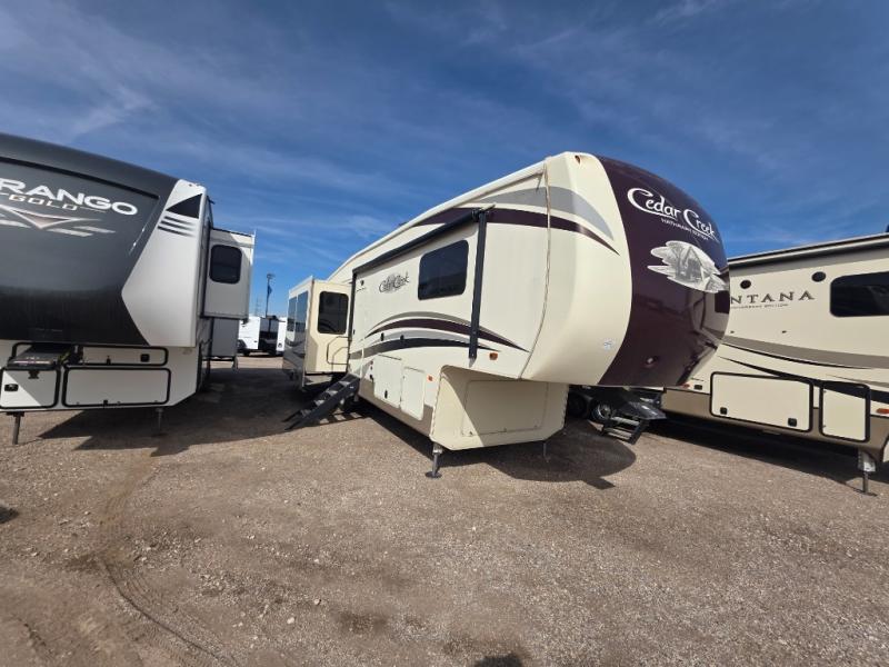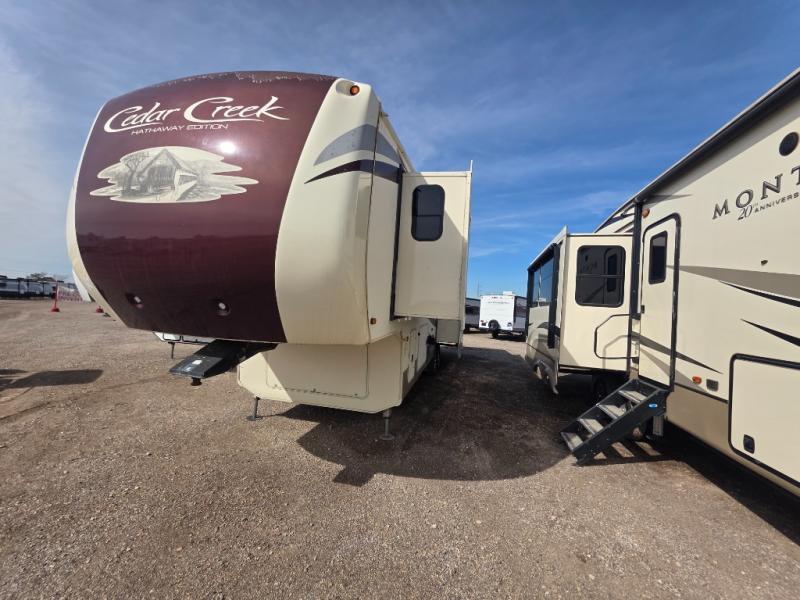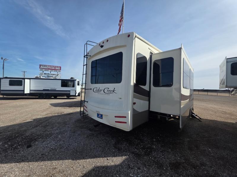 2017 USED Cedar Creek 34RL fifth wheelYou will find room for everything in the triple slide Cedar Creek 34RL fifth wheel from Forest River RV.