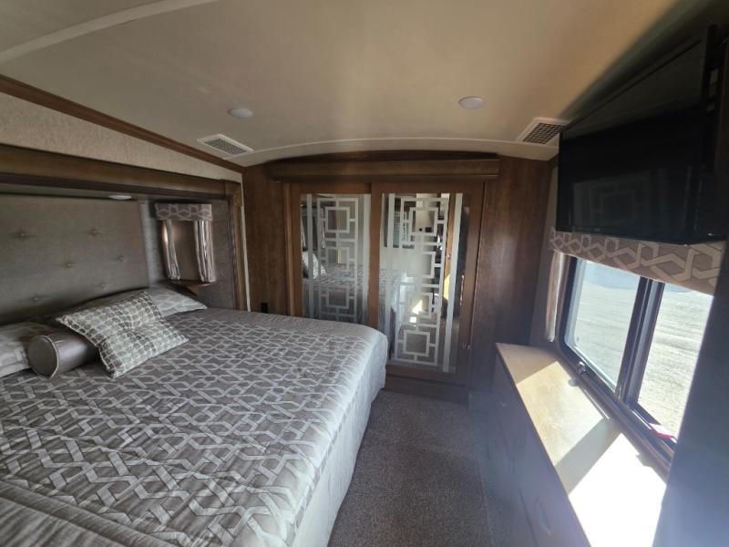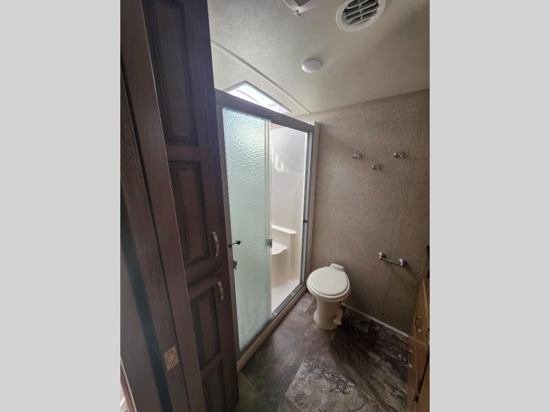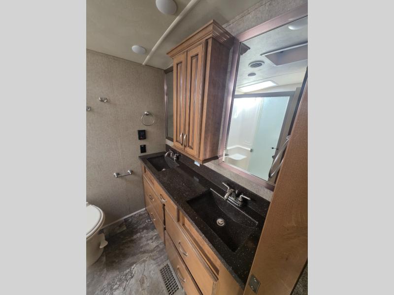 Enjoy a luxurious and spacious private bedroom with a slide out queen bed with shelves on either side. You may choose to add an optional king bed. Plenty of storage options are included with a linen cabinet with hamper, a vanity at the foot of the bed and a full width wardrobe closet with drawers at one end and shelves at the other. There is even washer/dryer prep inside the wardrobe, and more!
