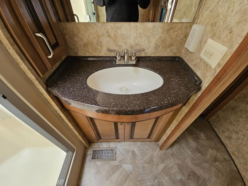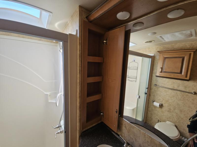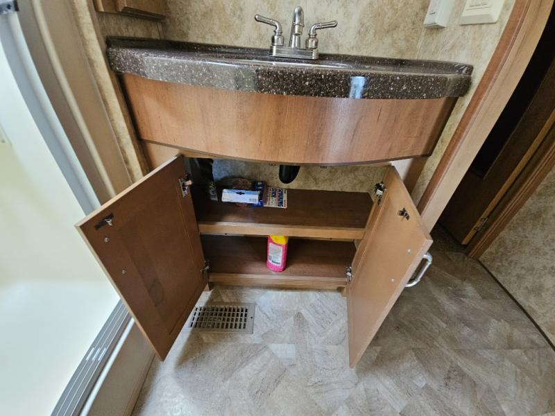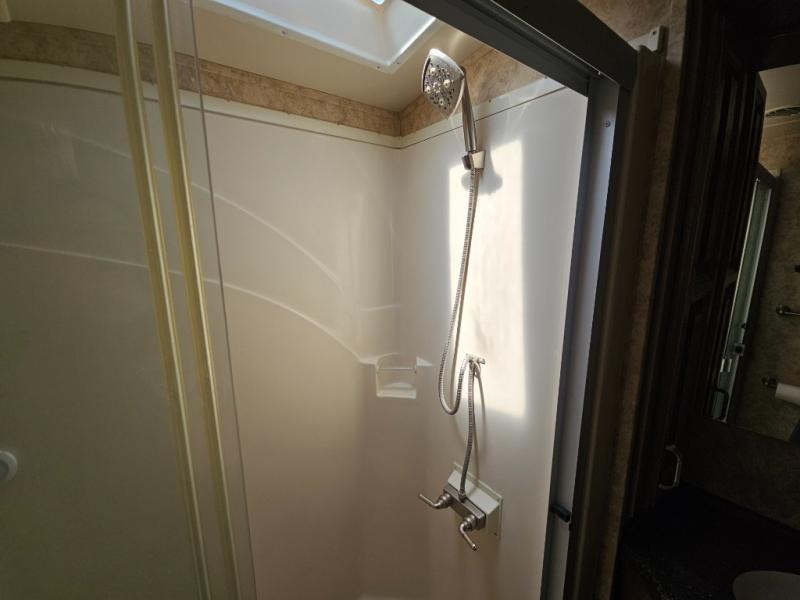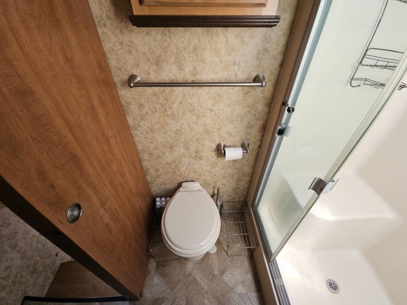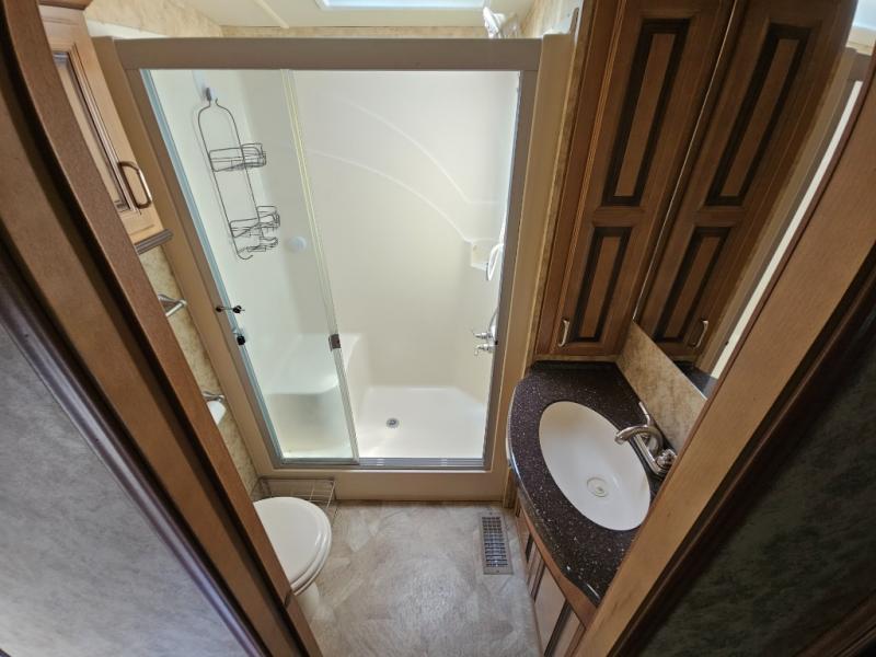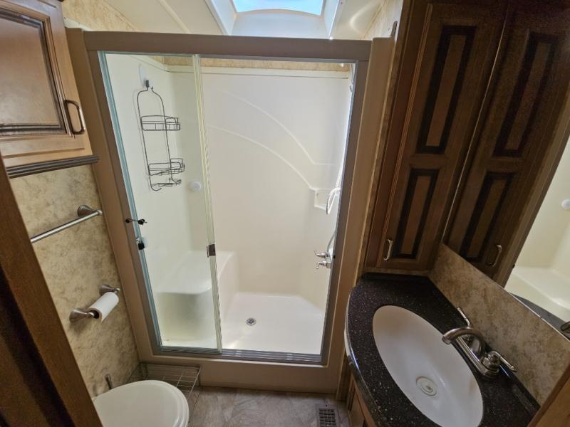 Up the steps towards the front of the fifth wheel the bathroom is on your left. It includes a vanity sink, medicine cabinet, residential size shower with seat, toilet and overhead cabinet.