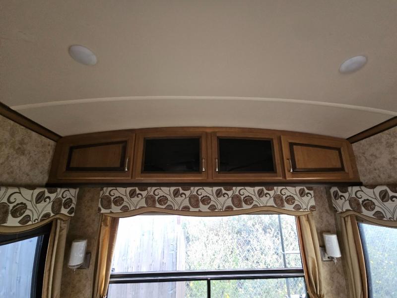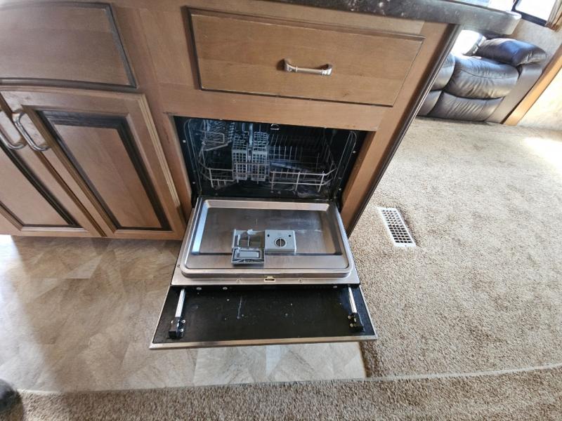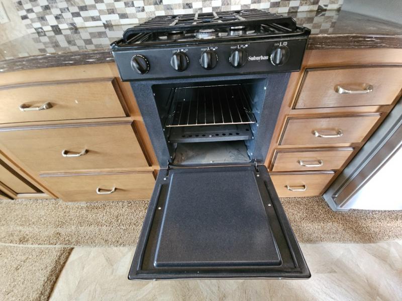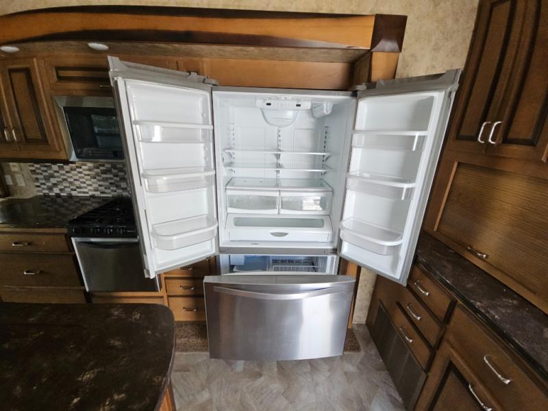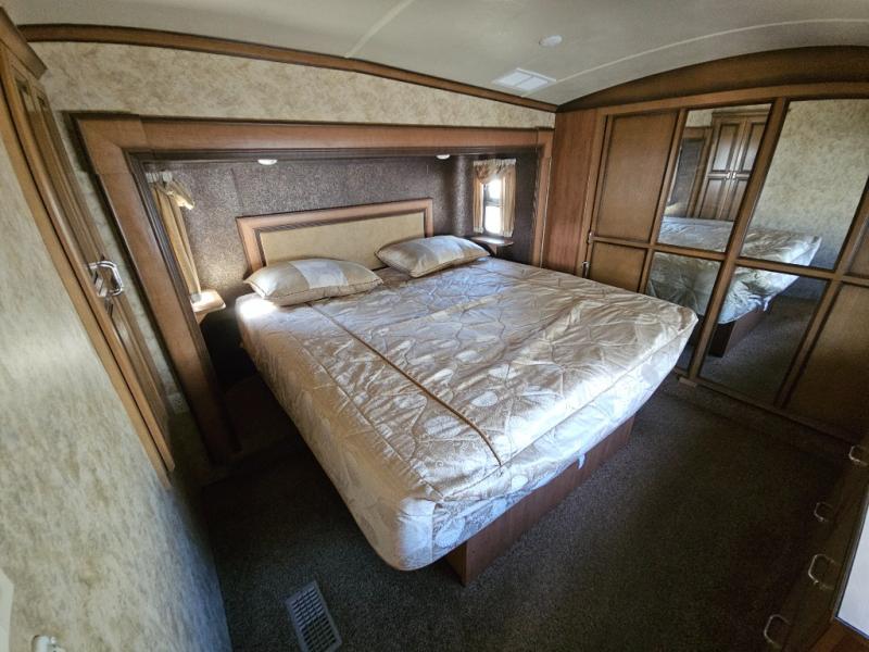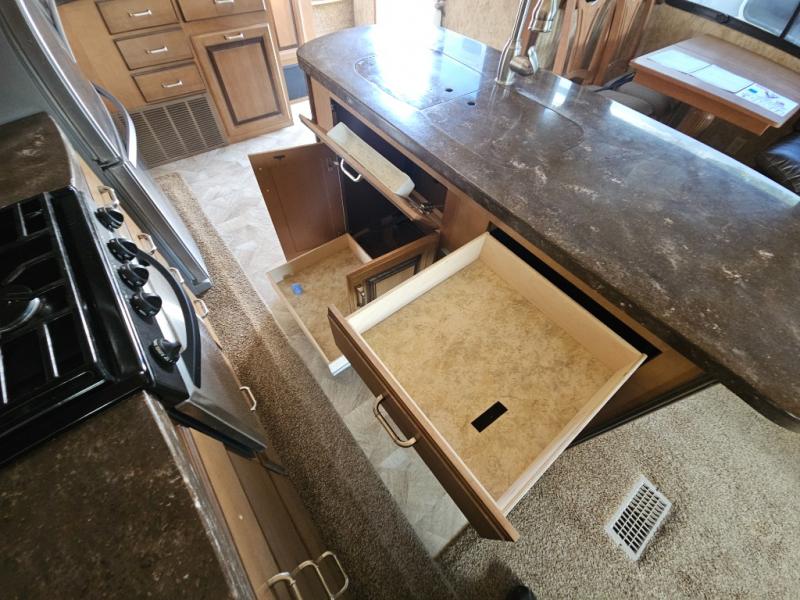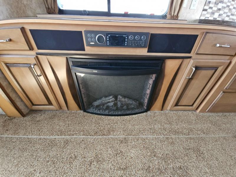 Two generous slide outs are located in the main living/kitchen area. As you enter this Cedar Creek, to the left is a slide out which has a free standing dinette with chairs, and two lounge chairs. A sofa with end table at each end and overhead cabinets runs the width of the back wall. Continuing around, another slide features a fireplace with TV lift, three burner range top, overhead microwave, pantry, refrigerator, and overhead cabinet storage. The kitchen is rounded out with a beautiful Hoosier style kitchen cabinet with extra counter space, a closet and an island with a double kitchen sink. You may choose to add an optional dishwasher to the island.