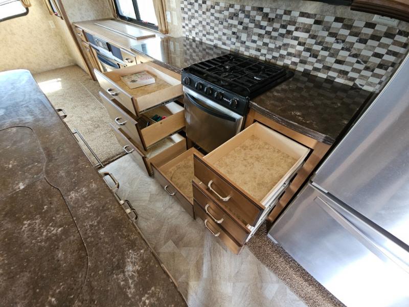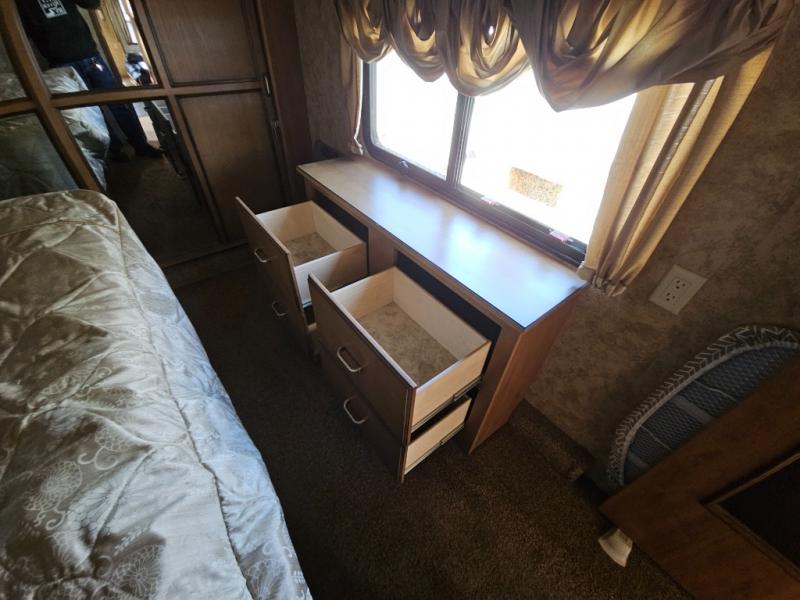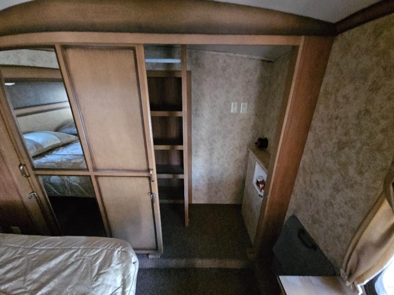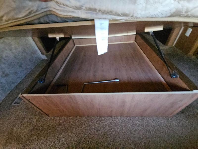 The private front bedroom offers a queen bed slide out with a shelf on either side. There is also a linen area with hamper, dresser and full width wardrobe with shelves and drawers for all of your storage needs and much more.